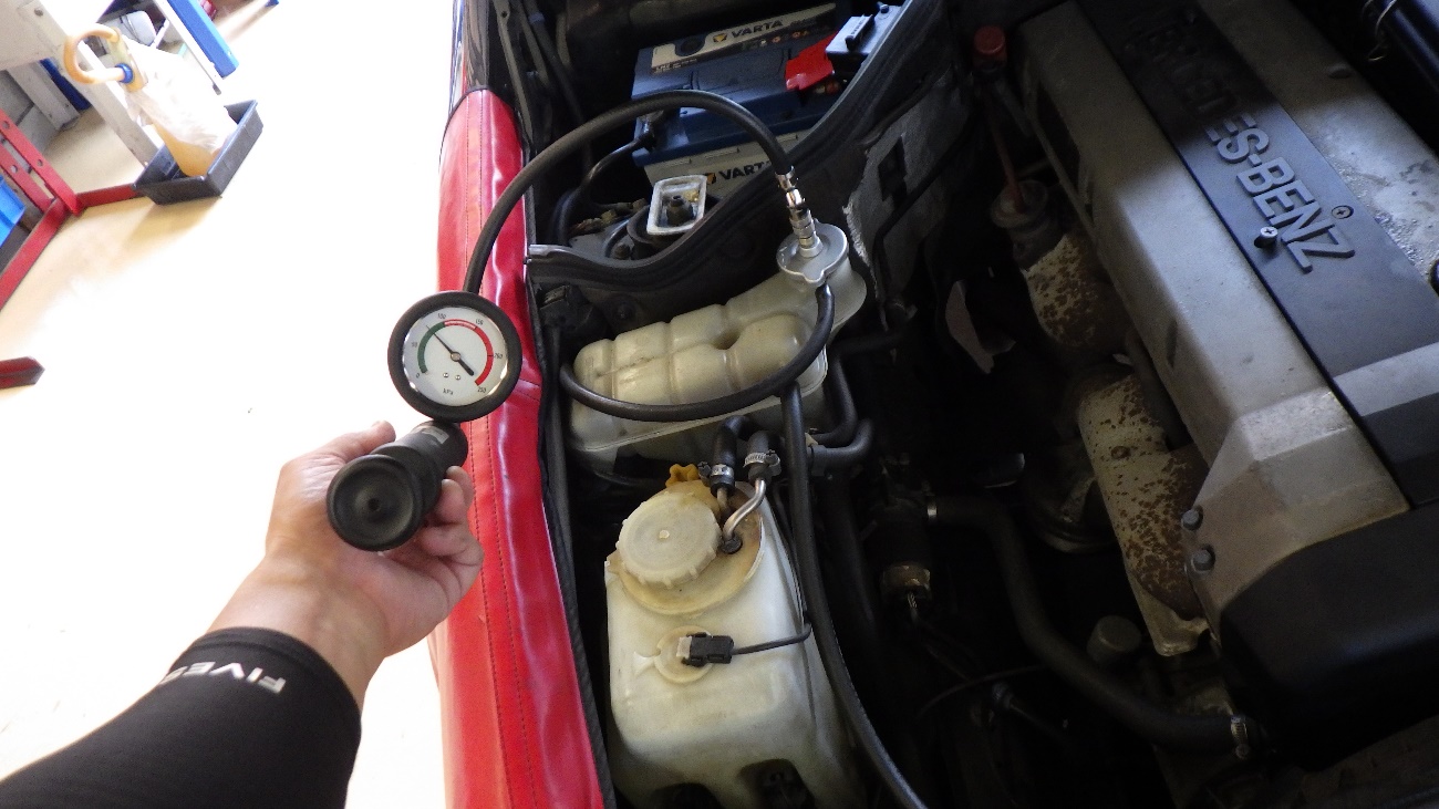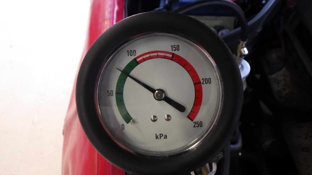 高年式車両ですので、加圧が強すぎると破裂する恐れがあるので、今回は80kpaで加圧状態を保持している様子になります。