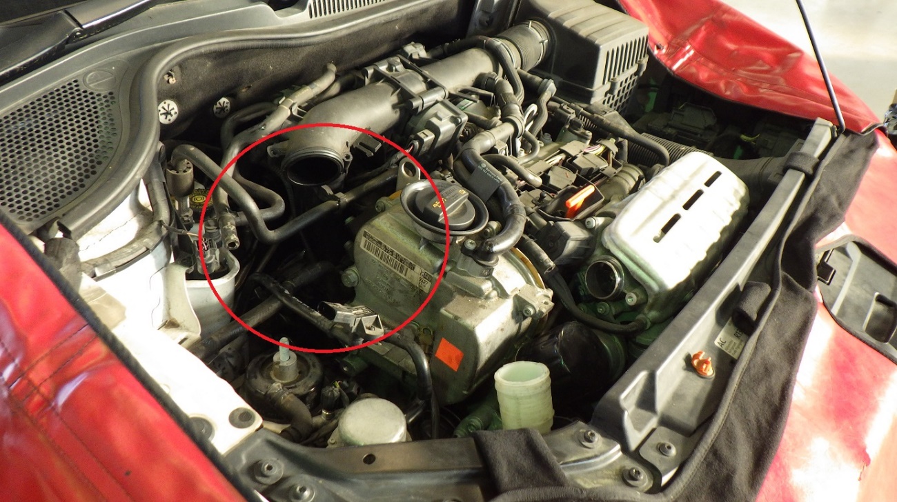 分解中の画像です。赤丸印の部分がウォーターポンプの取付場所です。