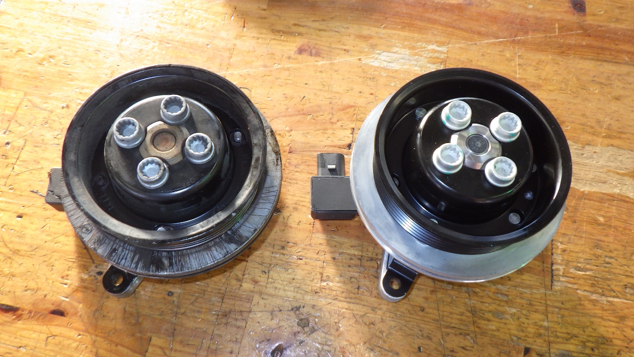右側が新品部品です。取り外したウォーターポンプは軸の部分のクーラント漏れとガタがありました。
