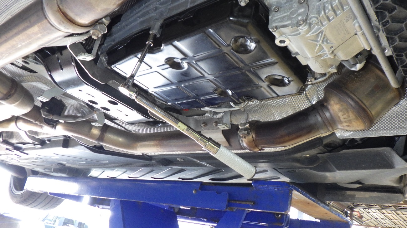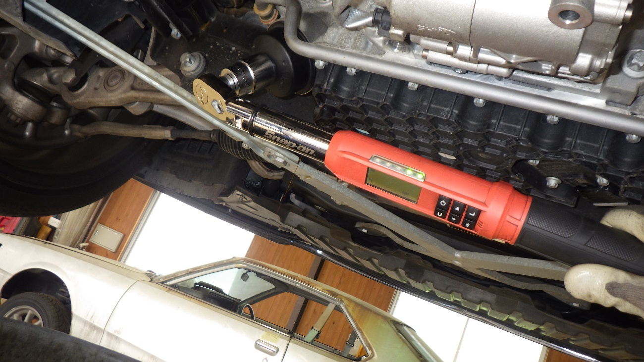 ストレーナー交換実施後、キレイに清掃を行い、オイルパンを締め付けている様子になります。規定トルクにて締め付けております。