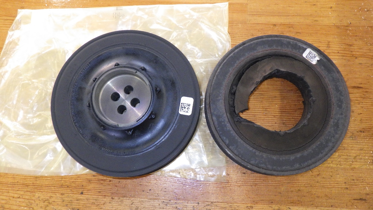 正常な部品は画像の左側のプーリーと右側のプーリーがゴムで一体になっています。