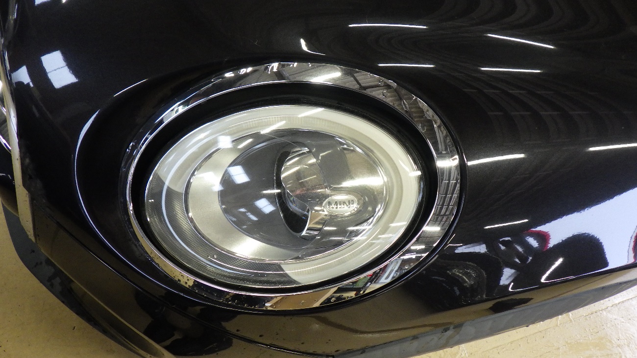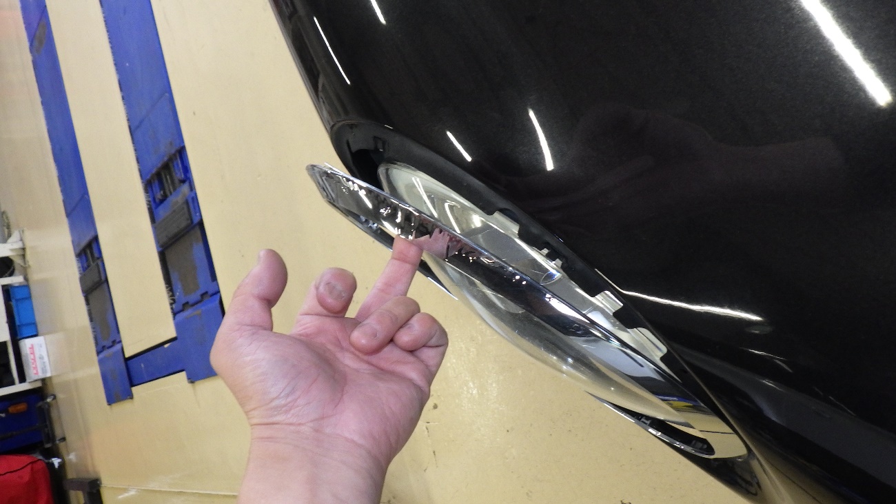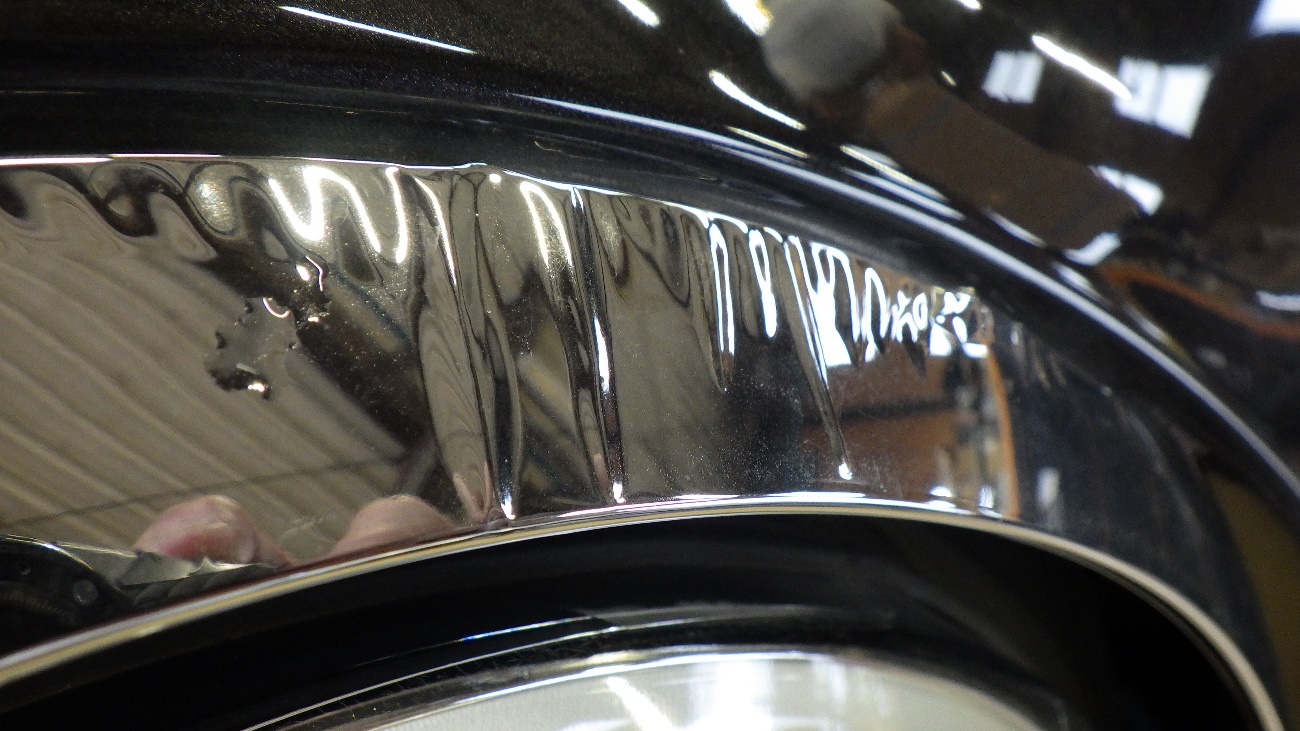 フロントヘッドライトメッキリングが浮いており、爪が折れておりましたので新しいメッキリングに交換させて頂いております。