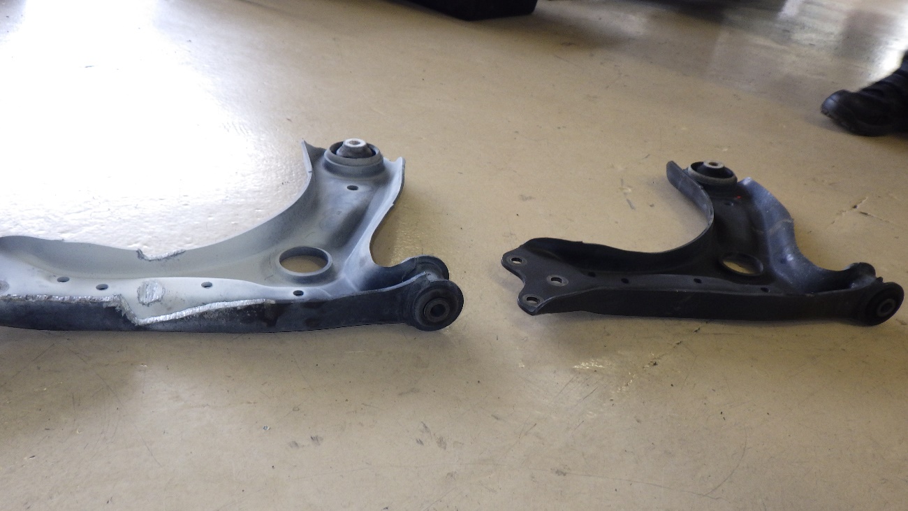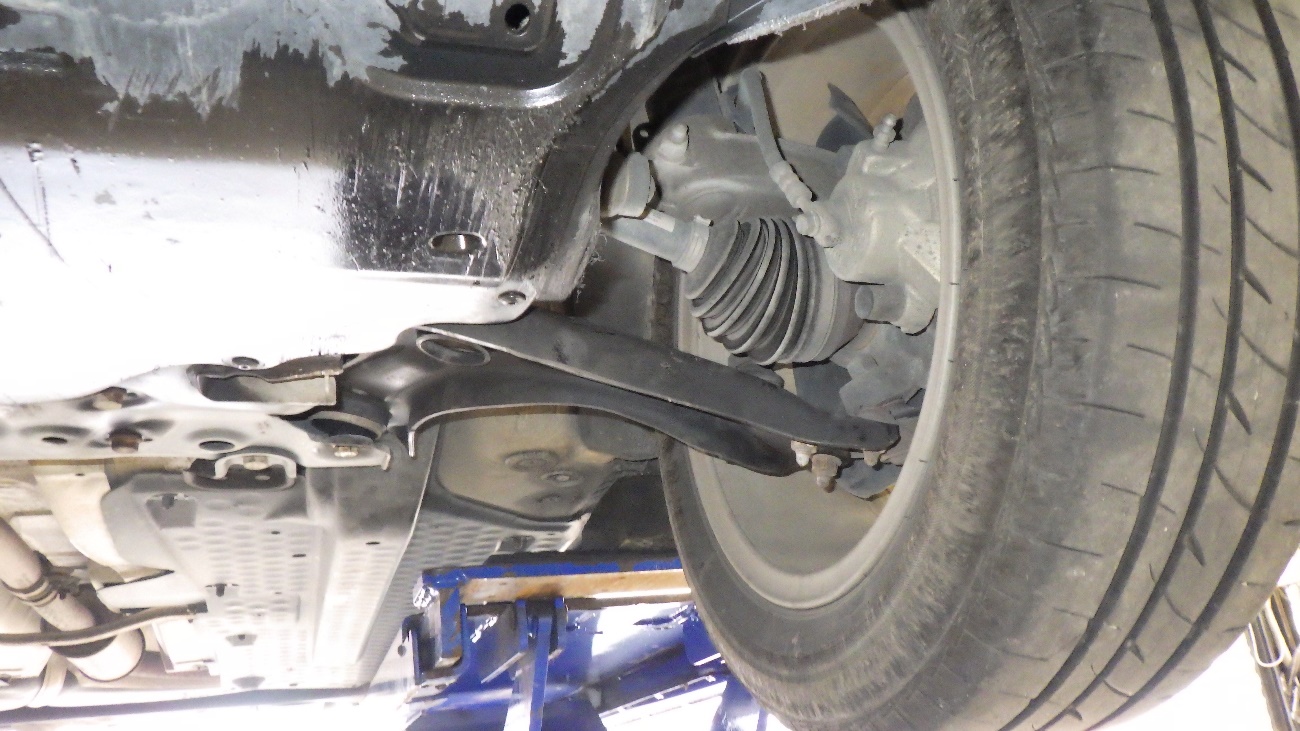 前回現状確認さえて頂いた結果、左フロントロアアームが削れておりましたのでロアアームの交換と、