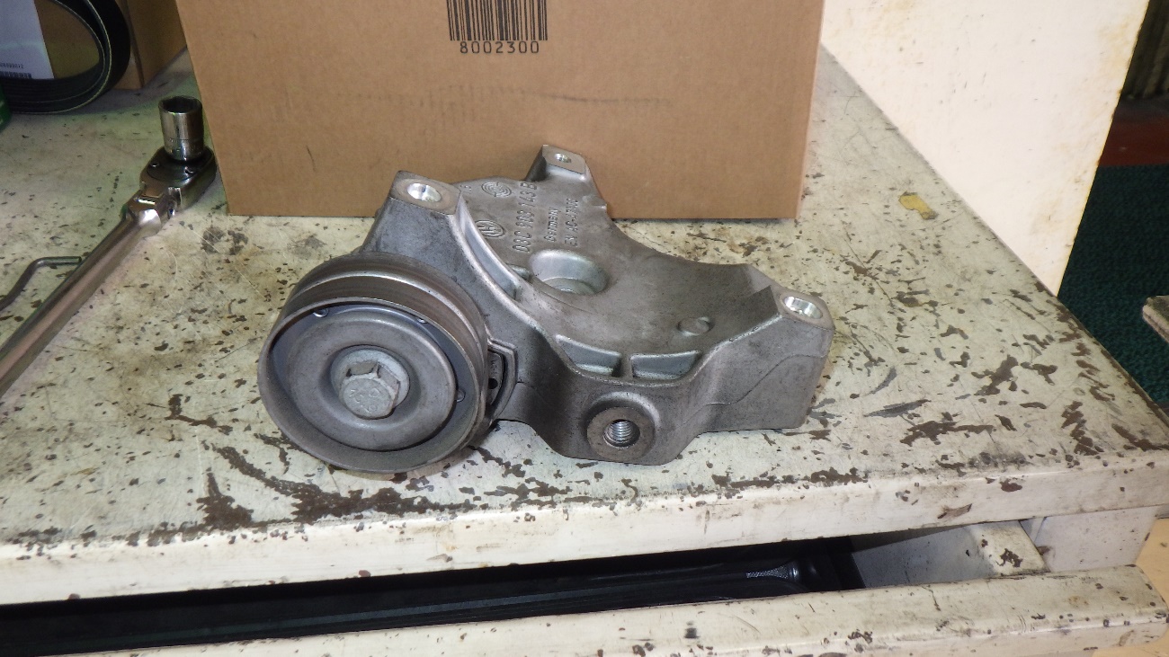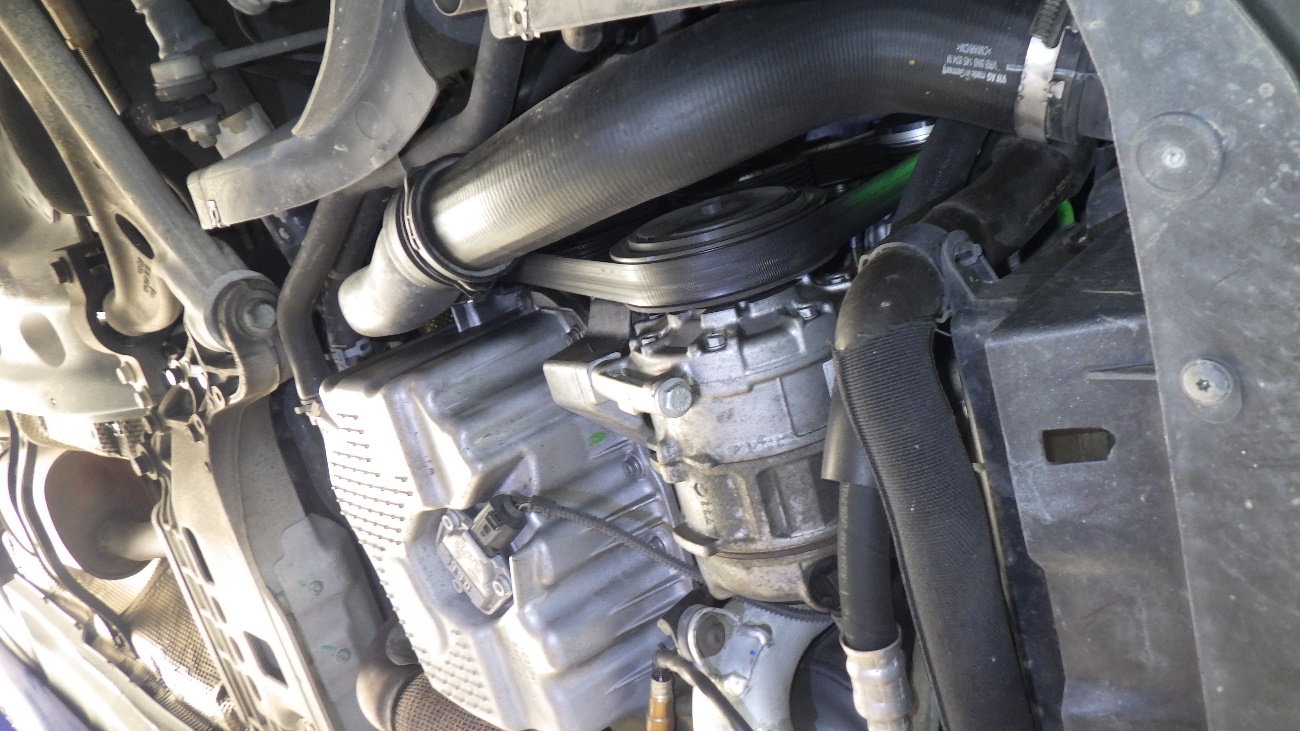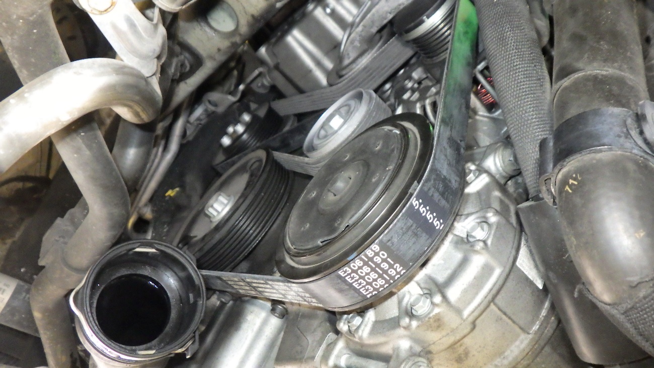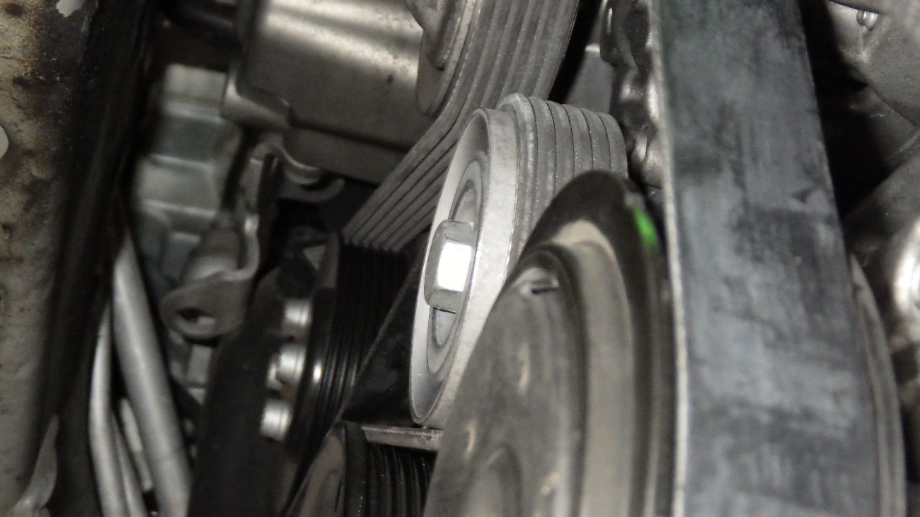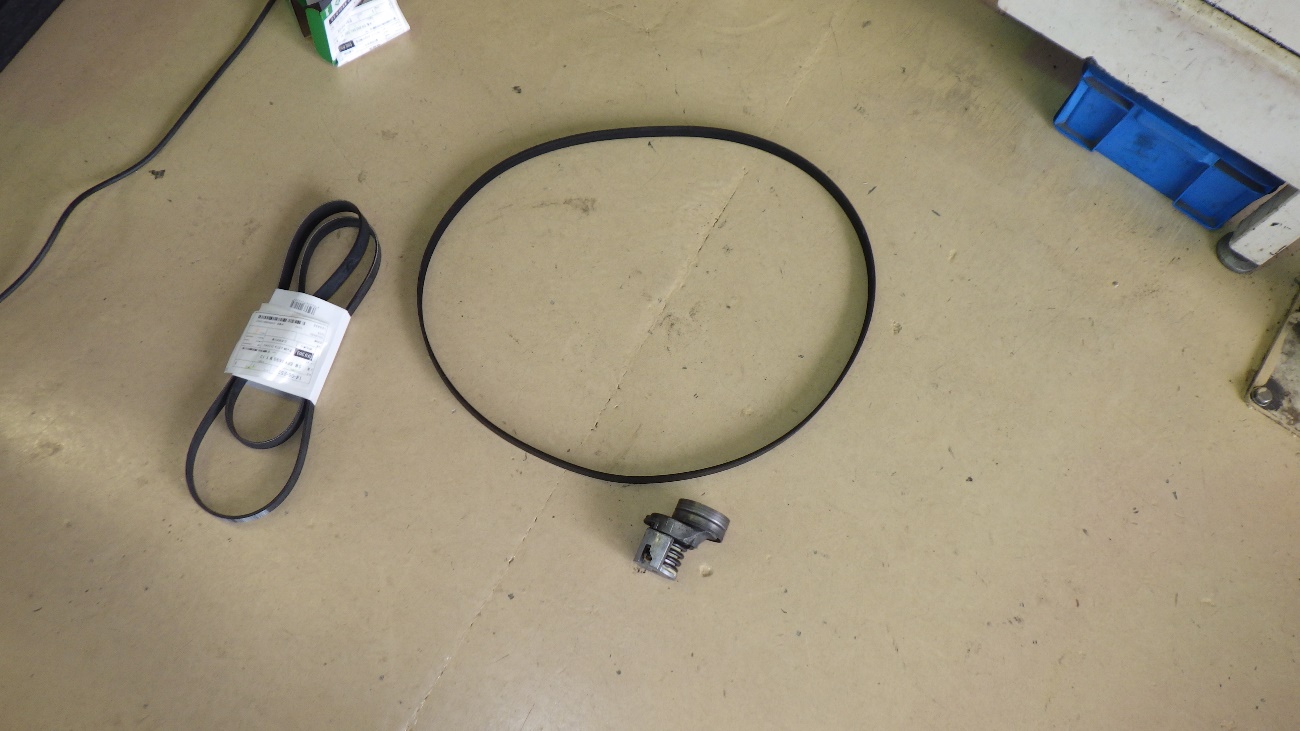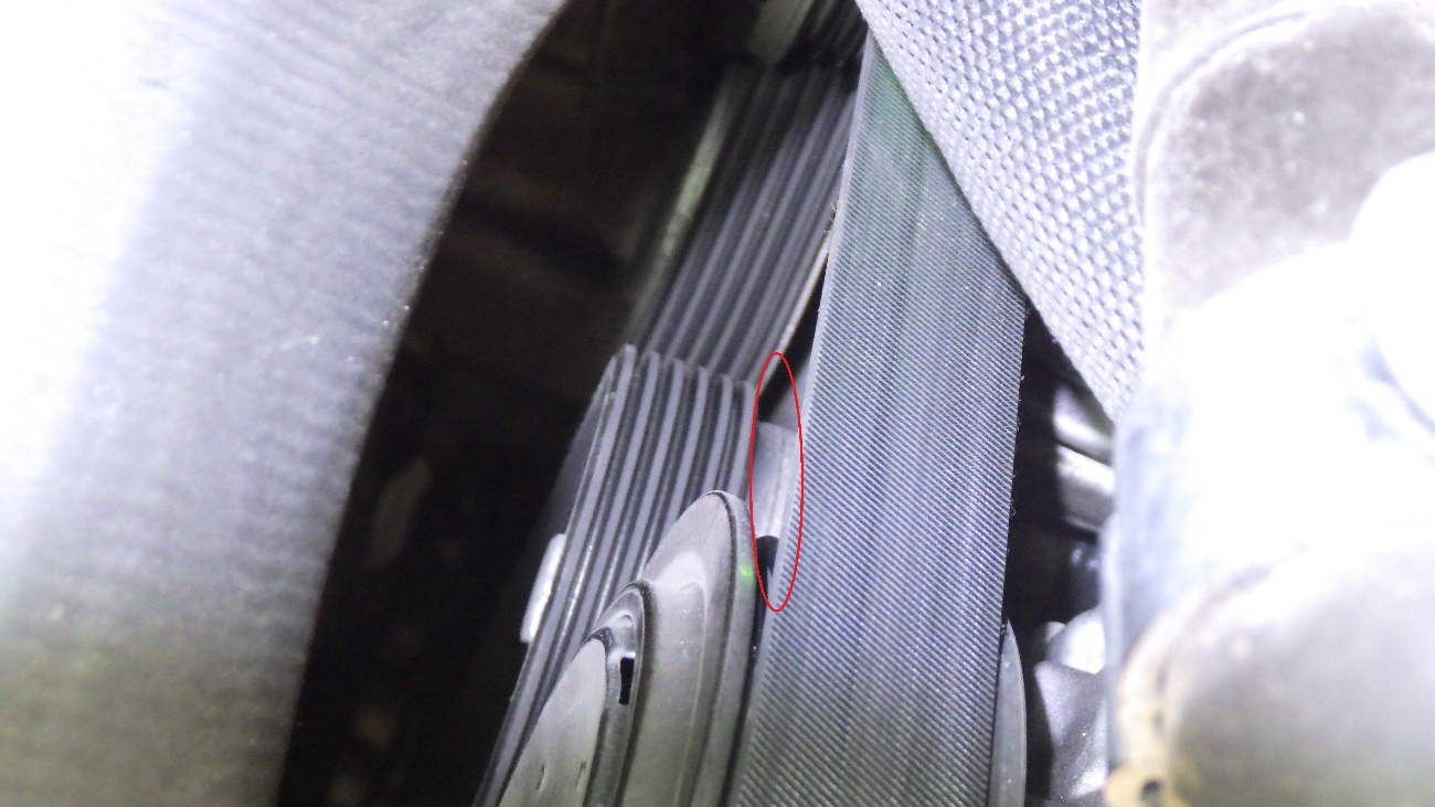 診断の結果、ベルトテンショナーのガタの影響でベルトがズレ、「キュルキュル」と異音を発生しておりました。ドライブベルトと、ベルトテンショナーの