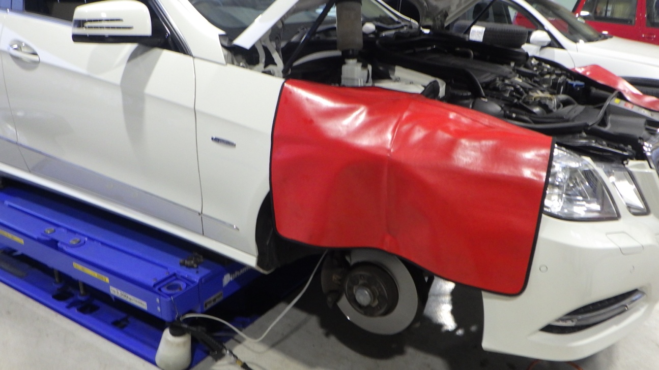 フロント足廻り損傷でのお預かりになります。 入庫後、入庫確認作業を行い、キズ、汚れ防止の為、ハンドルカバー、 シートカバーの取り付けを行いました。 入庫確認の後…