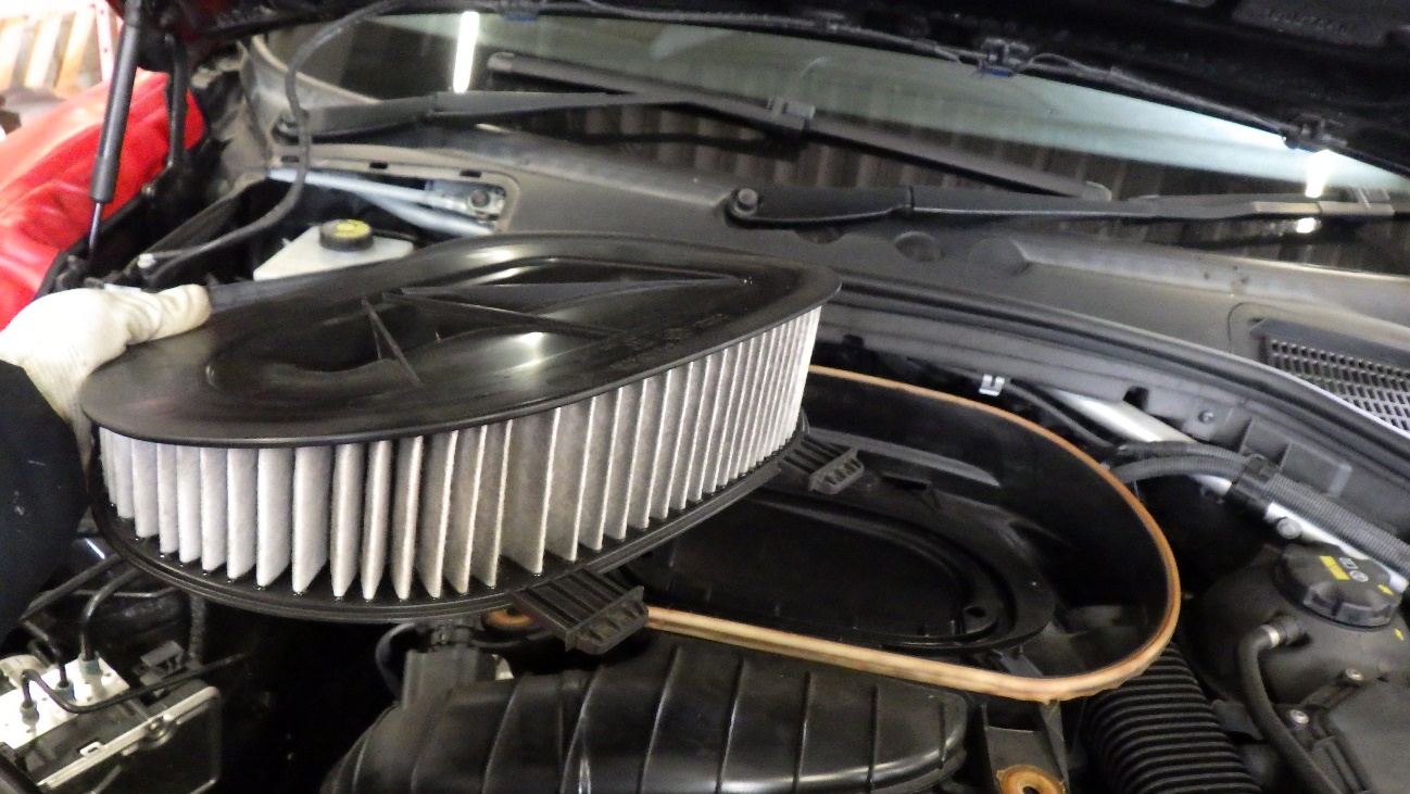 エンジン上部ではエアクリーナーの点検清掃を実施。
