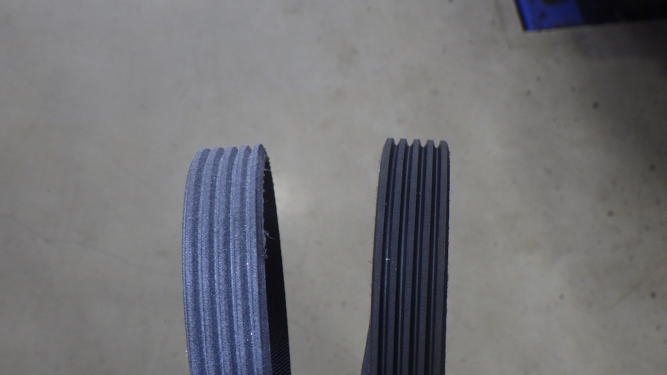 交換前(写真左側)、交換後のファンベルトです。