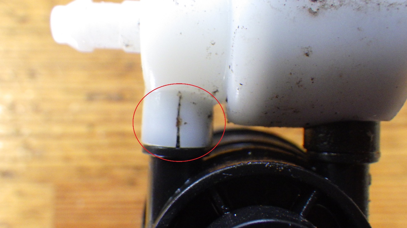 ウォッシャーポンプのホースが確着する付け根の部分が割れており、