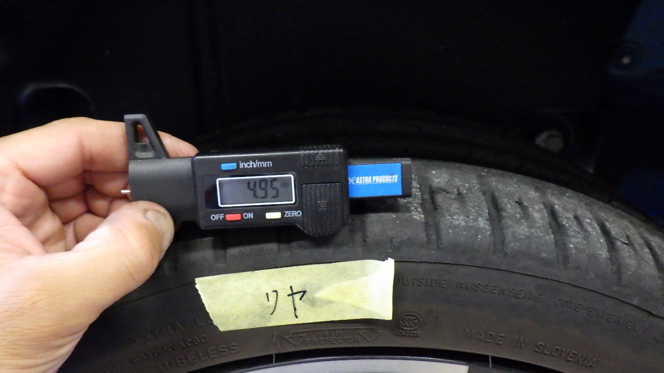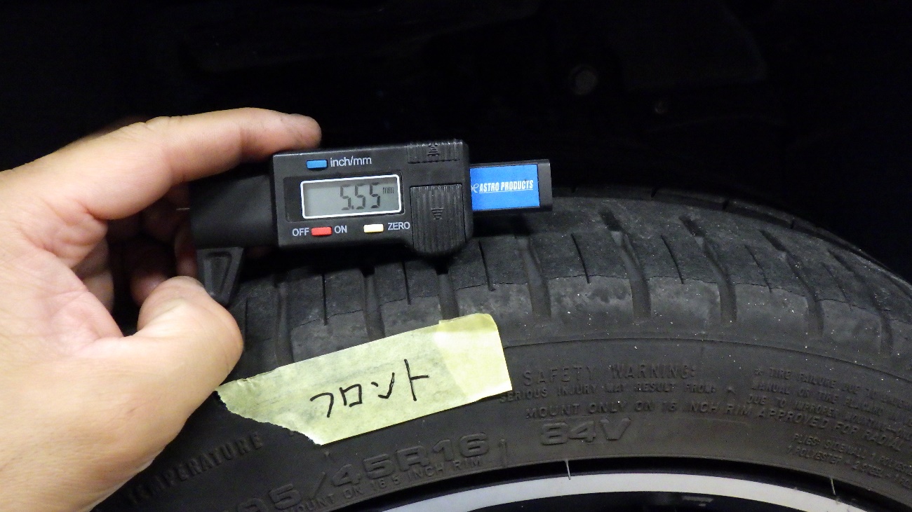 フロントタイヤの残量になります。ひび割れ等は見受けられますが残量は十分に残っておりました。