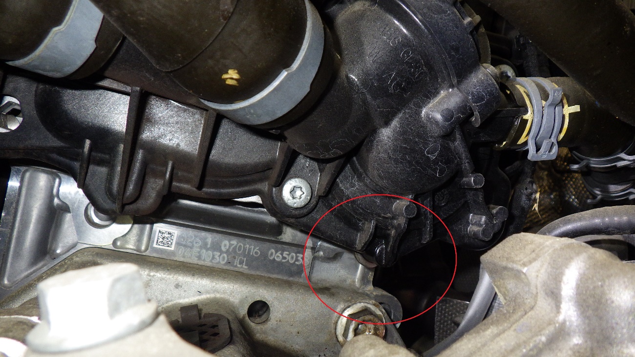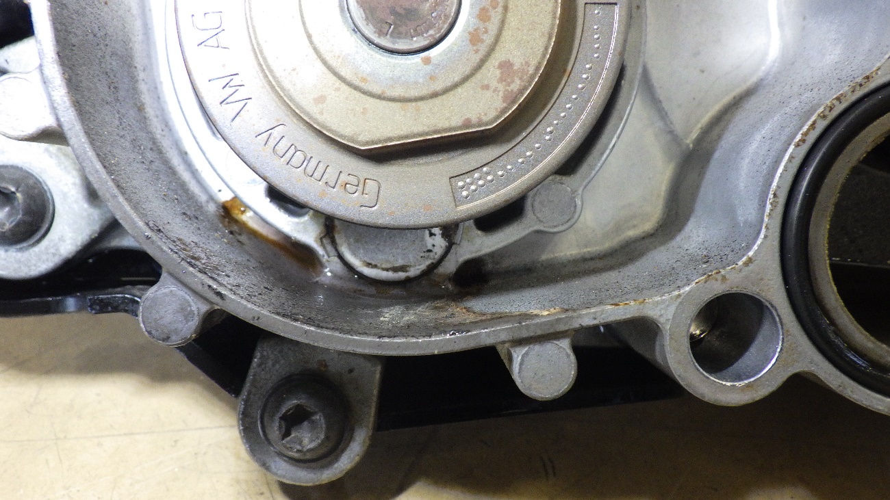 ウォーターポンプの裏側を確認したら、LLCが漏れている箇所が確認出来ました。