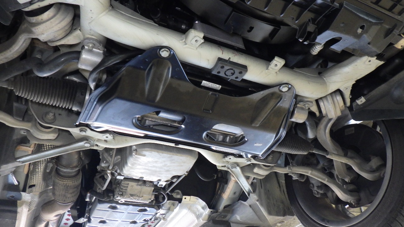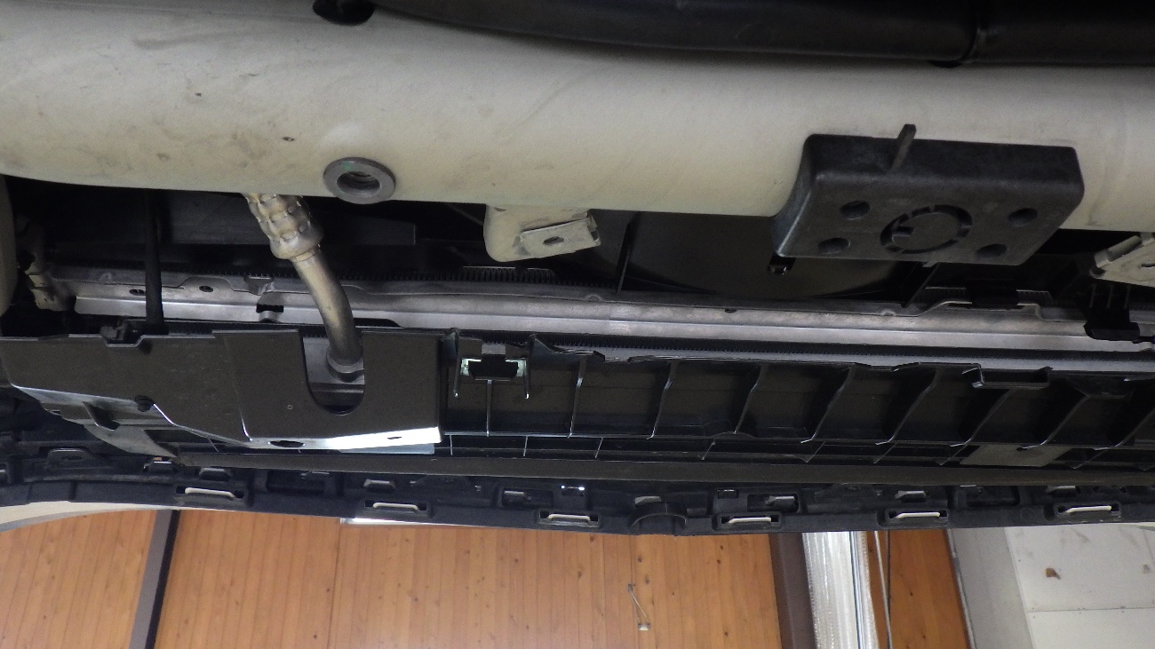 リフトアップを行い下廻り点検した結果、オイルクーラーが完全に破損しておりました。