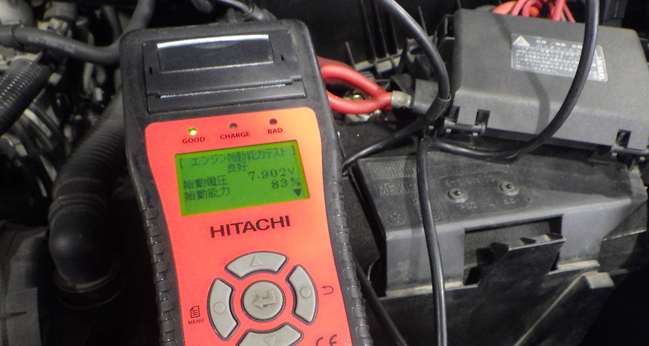 テスターにてバッテリーの点検を実施しています。