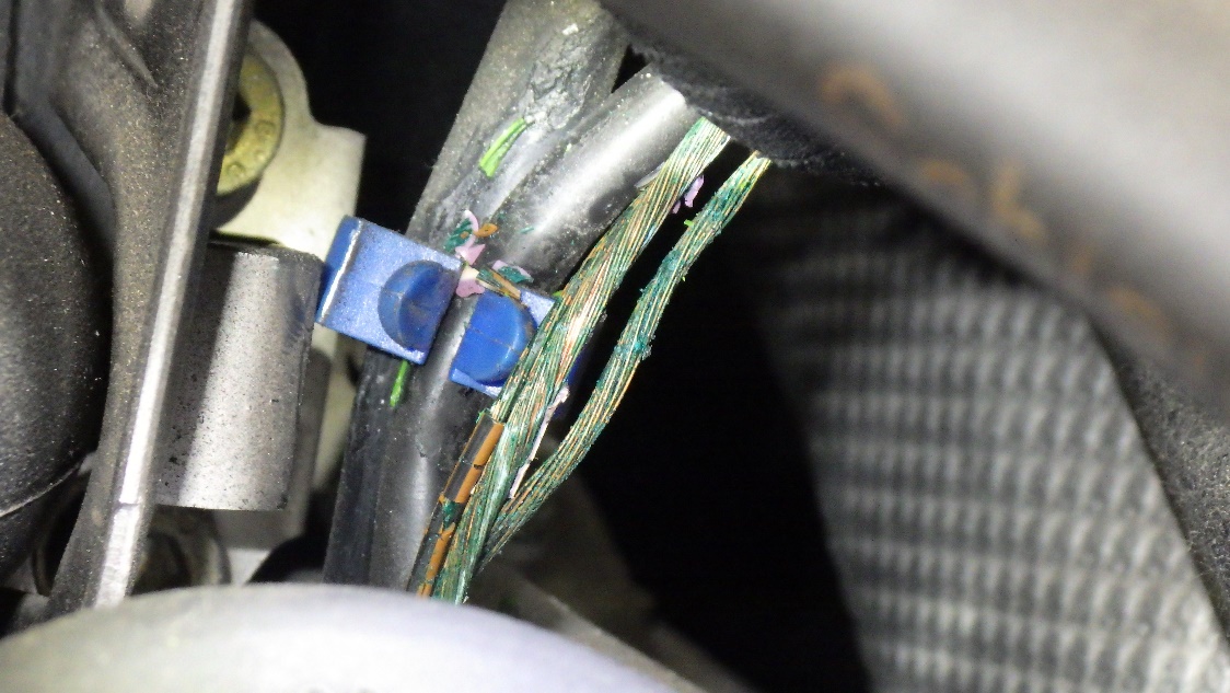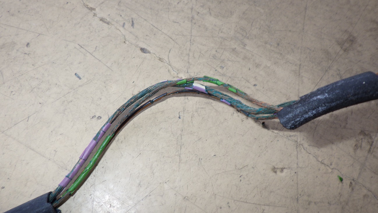配線被覆が劣化し内部の銅線がむき出しの状態です。