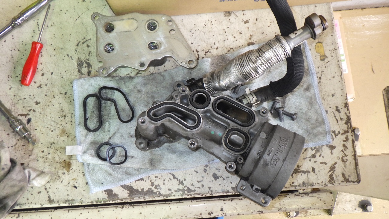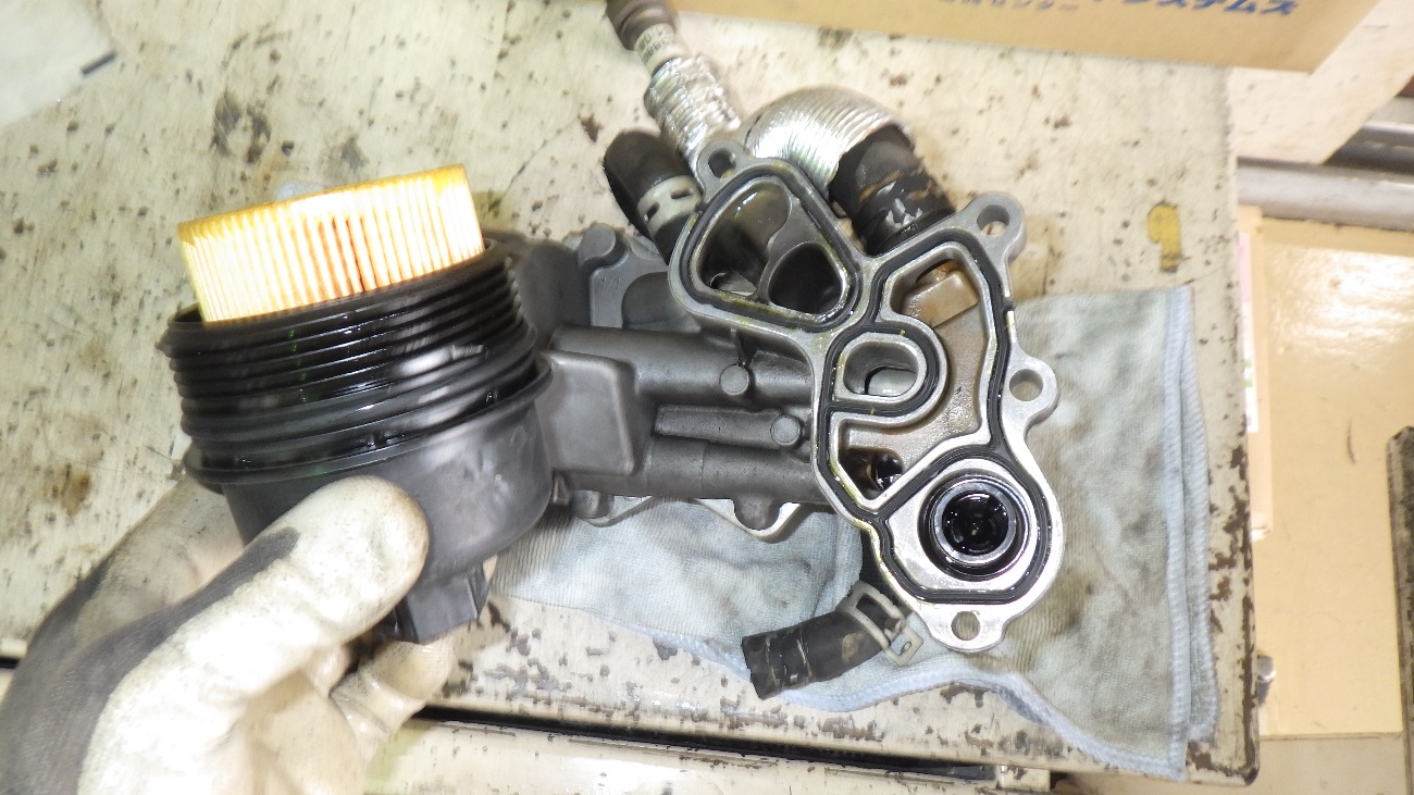 エンジンオイルフィルターハウジングが外れた様子になります。