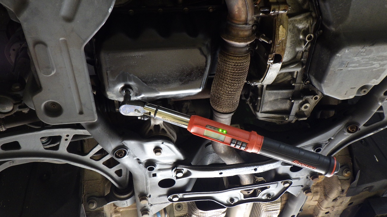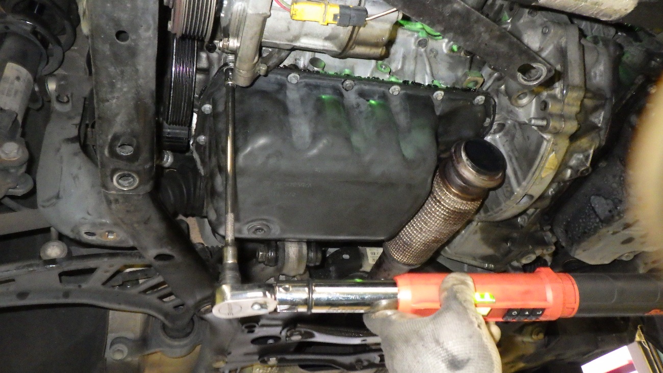 エンジンオイルパン再シーリング後、規定トルクにて締め付けております。