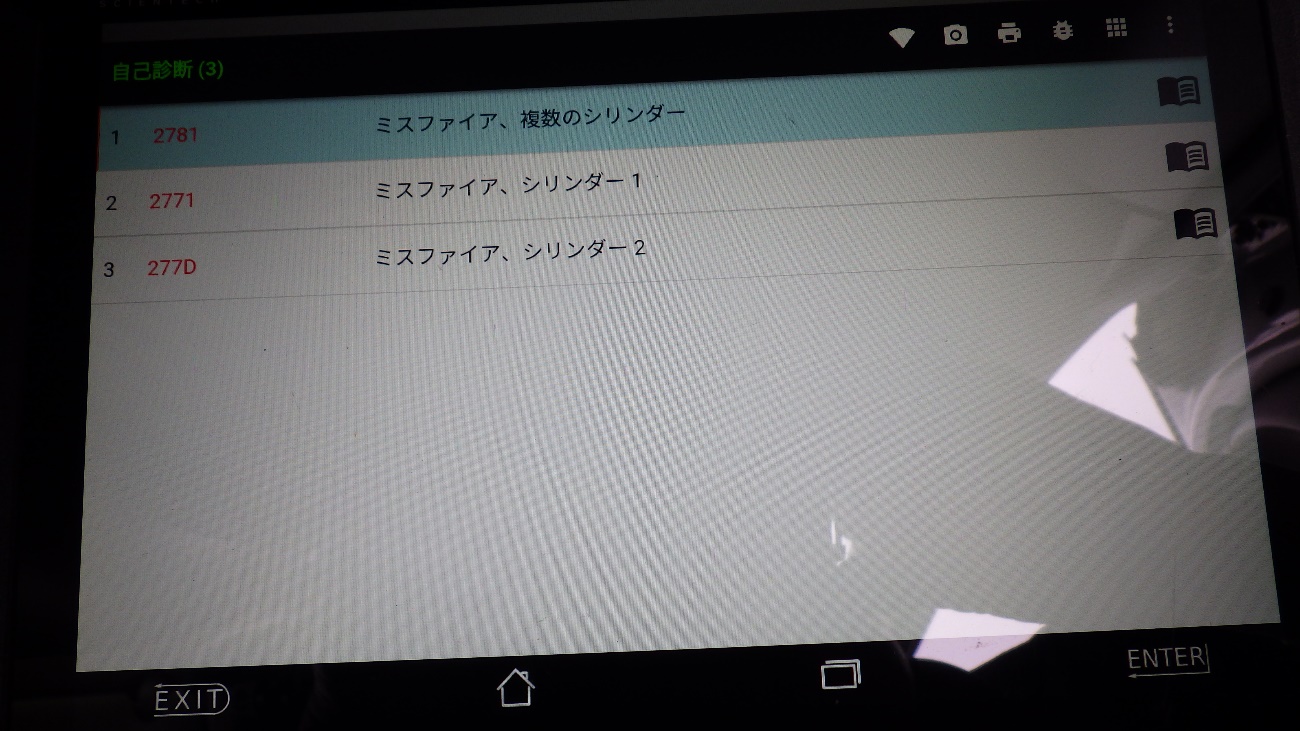 テスターの診断結果、1.2番シリンダーにミスファイア表示。イグニッションコイルの