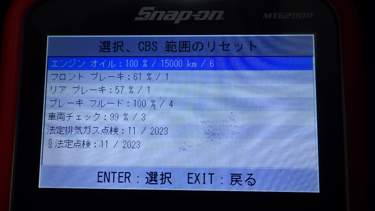 テスターにて故障コードの確認と、サービスのリセットを実施しています。