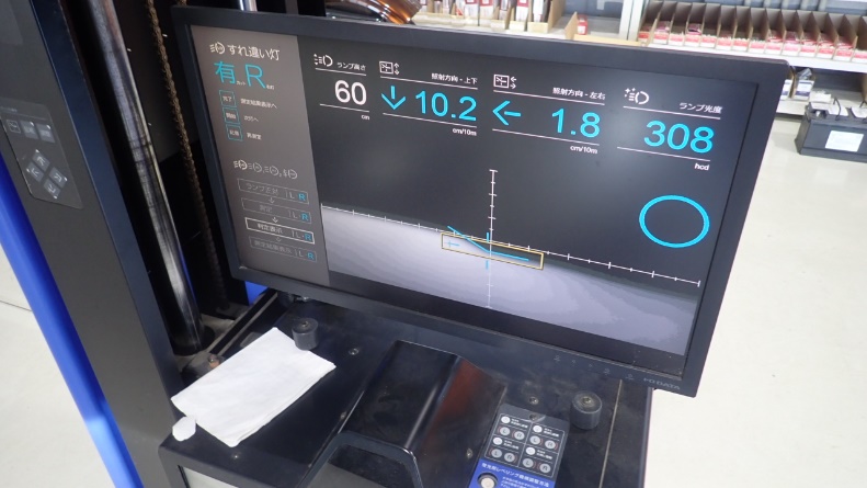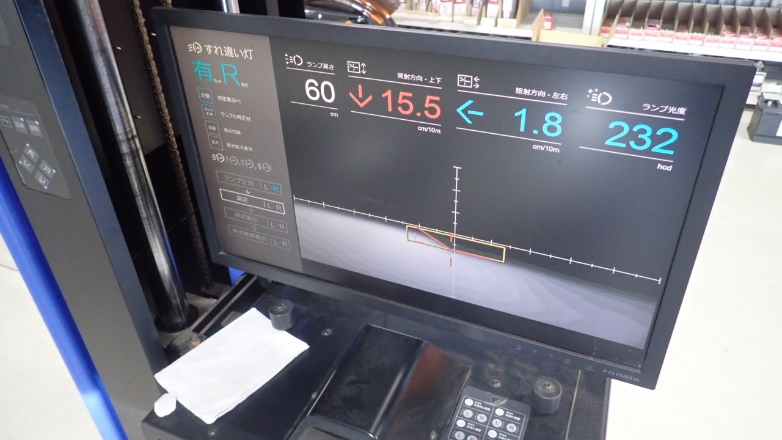 ヘッドライトの光軸が検査適合範囲で無かったため調整しております。