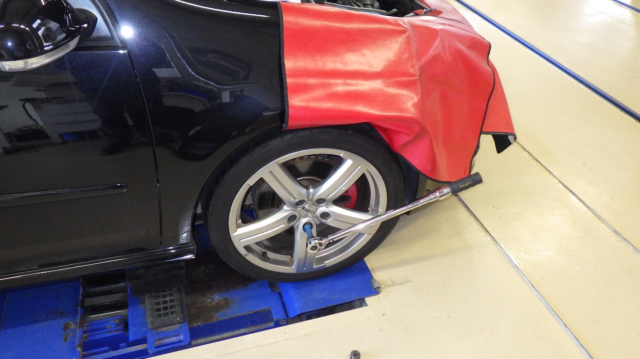右フロント廻り損傷でのお預かりになります。 まず初めに、ホイールへの損傷があったので、足廻りの計測作業を行いました。 足廻りの計測を行ない、数値に問題が無い事を…