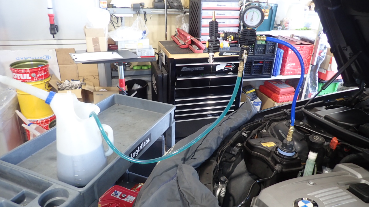 組み付け後、冷却系統を真空にし、冷却水を補充しています。