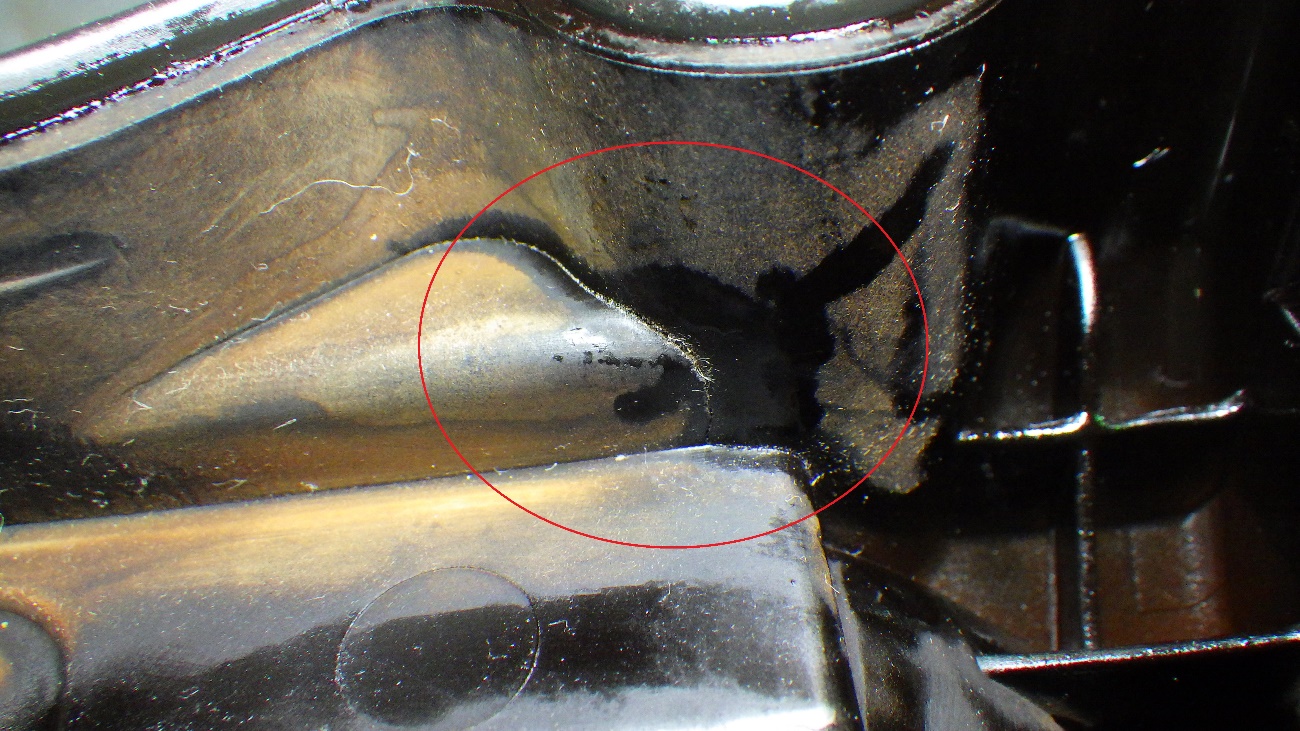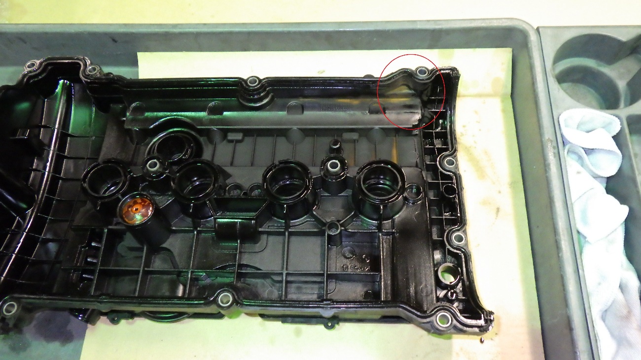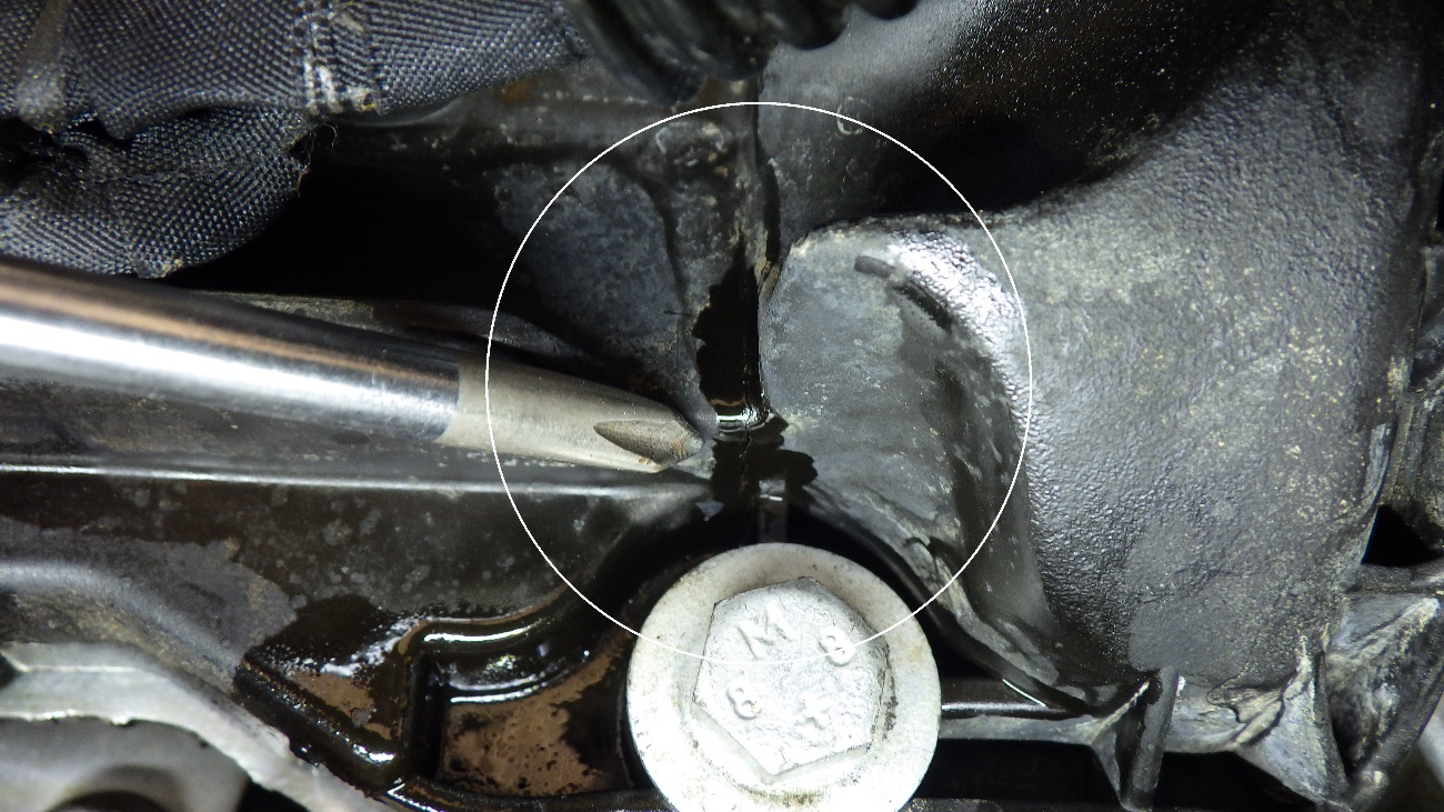 右上の赤丸部分に亀裂が生じオイル漏れを起こしておりました。