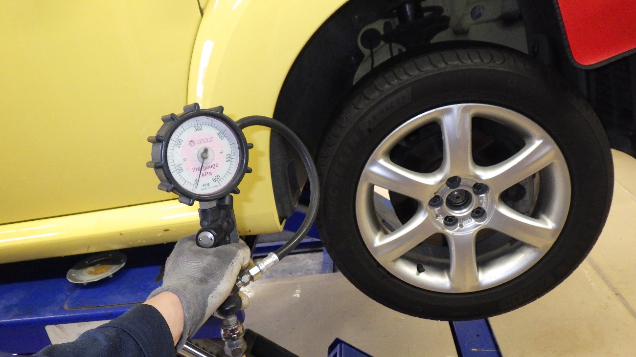 タイヤを組みつけて、空気圧の調整を行っております。