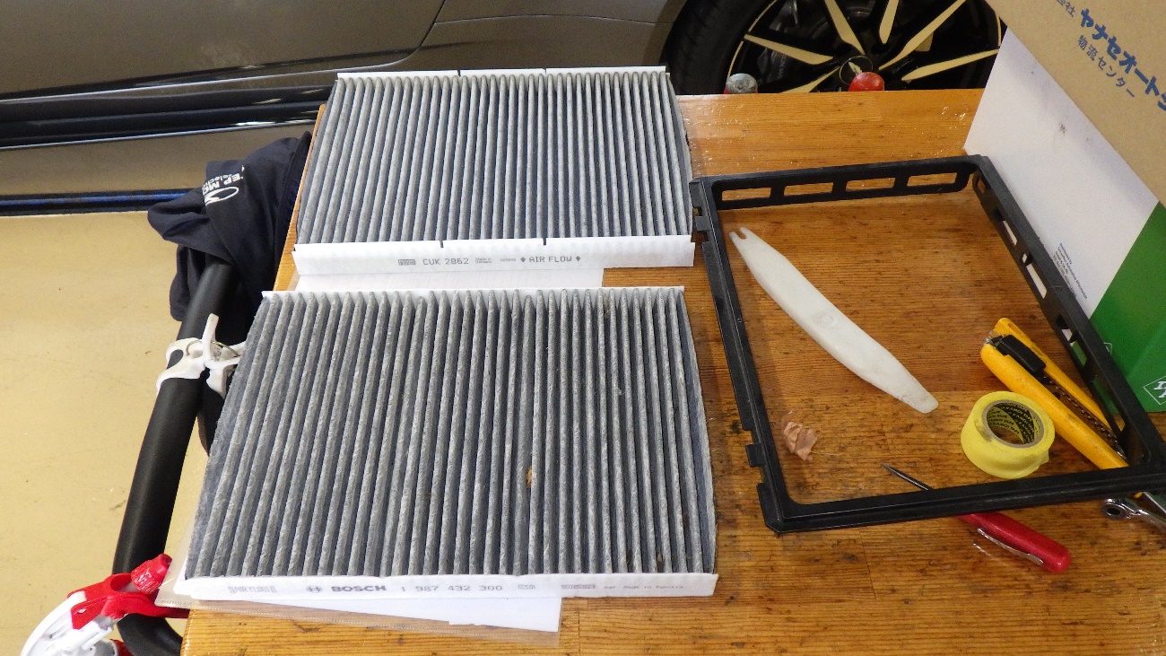 新旧比較したエアコンフィルターの交換様子になります。