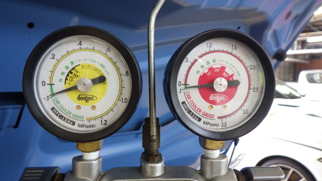 まずエアコンガスの充填量をマニホールドゲージにて確認して参ります。