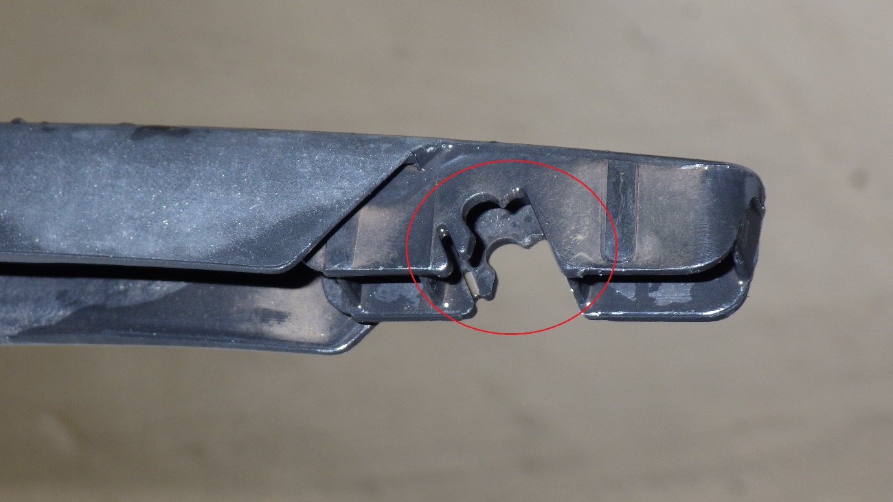 こちらのワイパーアームの部分で、ワイパーブレードを固定している部分が割れて