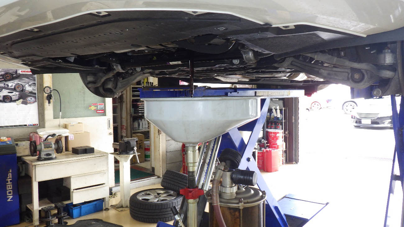 リフトを上げて、下からエンジンオイルを排出しております。
