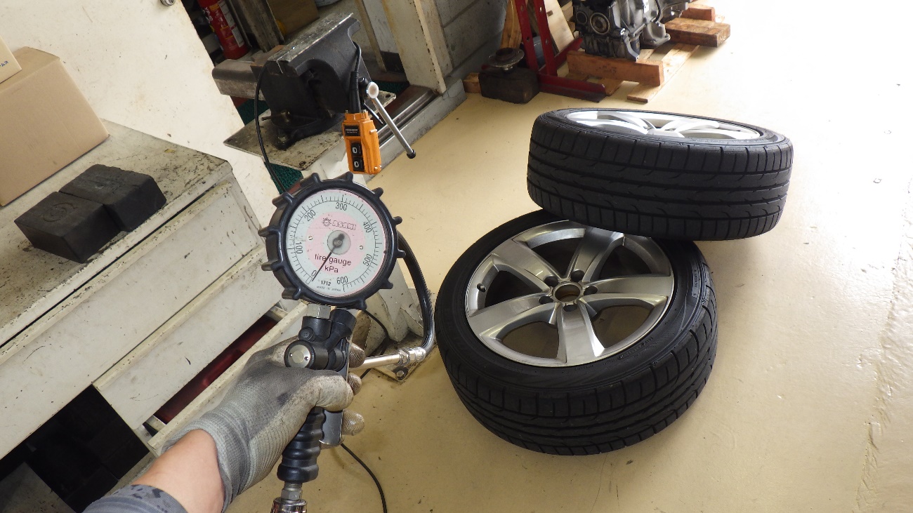 タイヤを外して空気圧の調整を行っております。