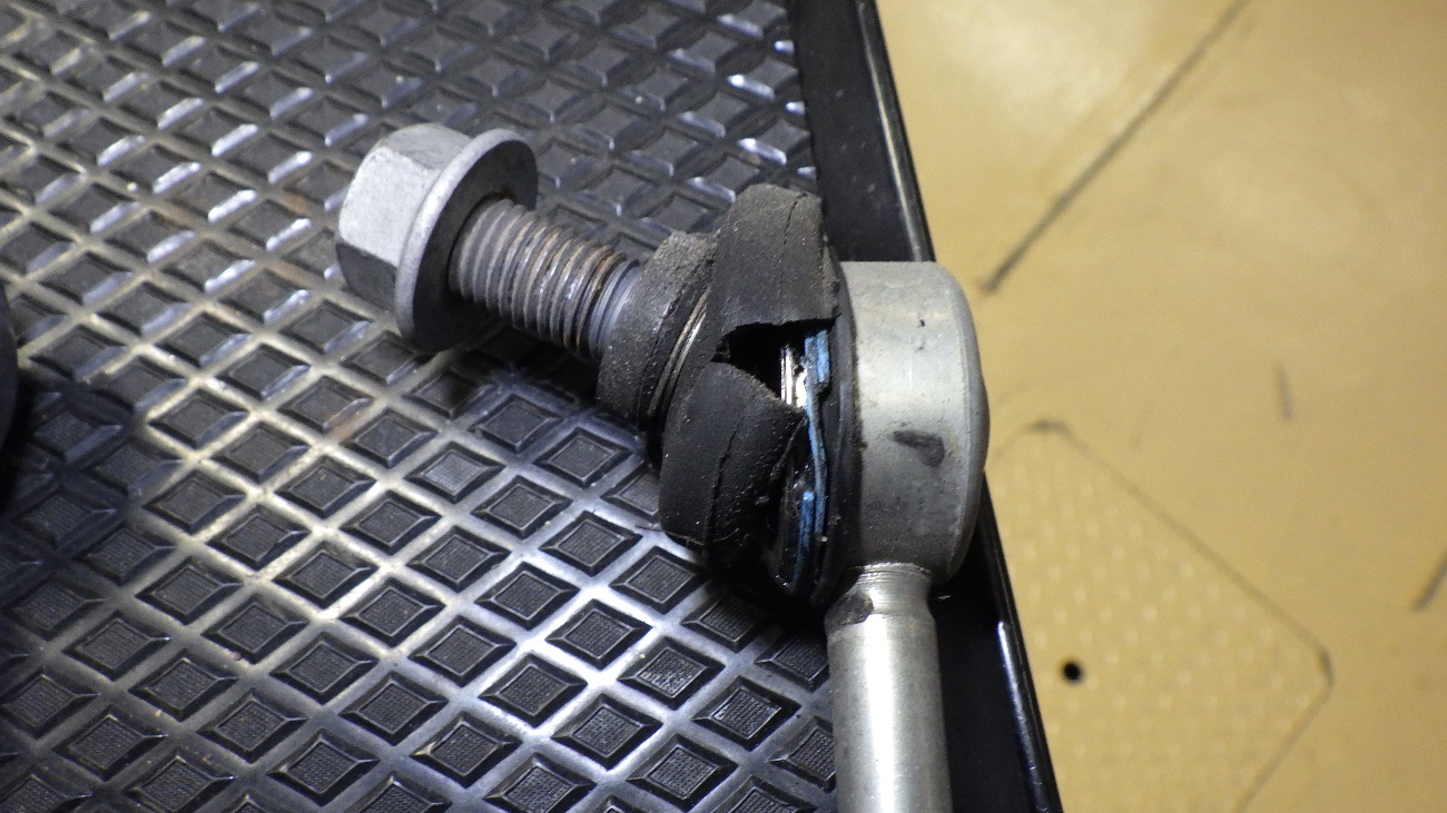 左側のスタビライザーリンクロッドのゴム部が破れておりましたので交換させて頂きます。