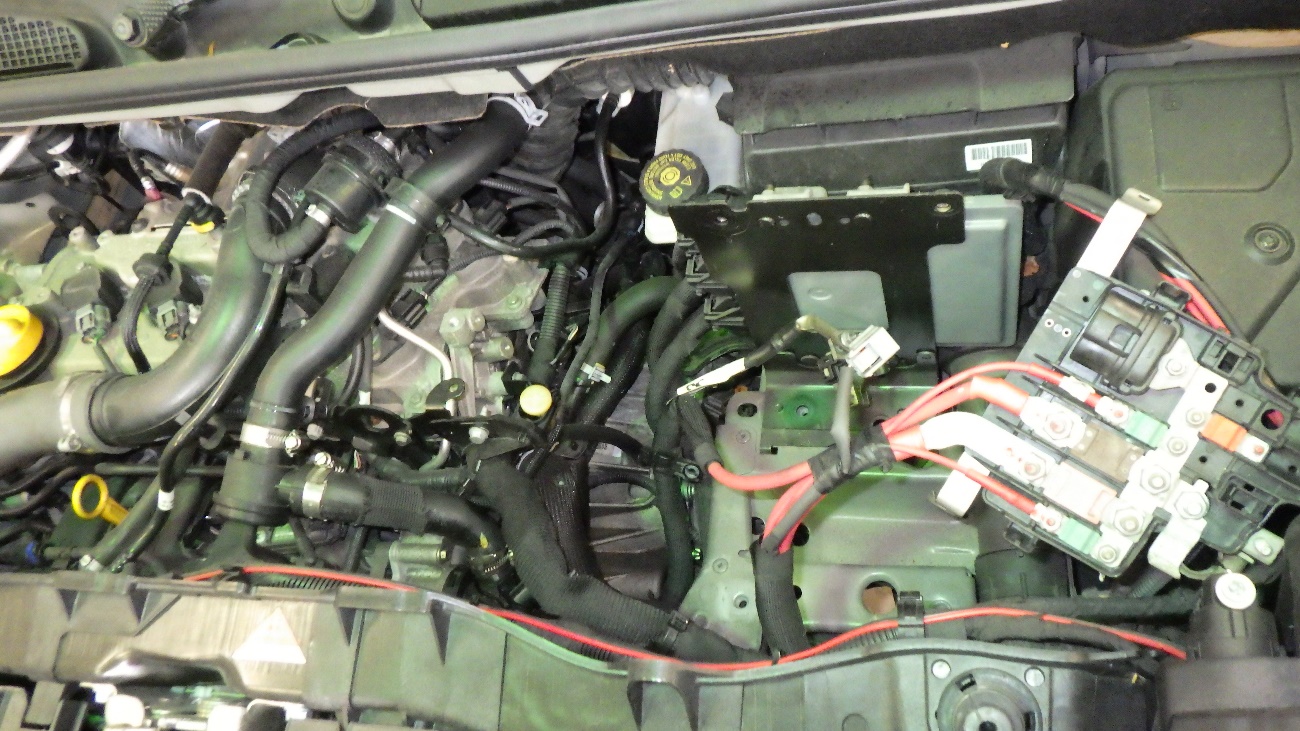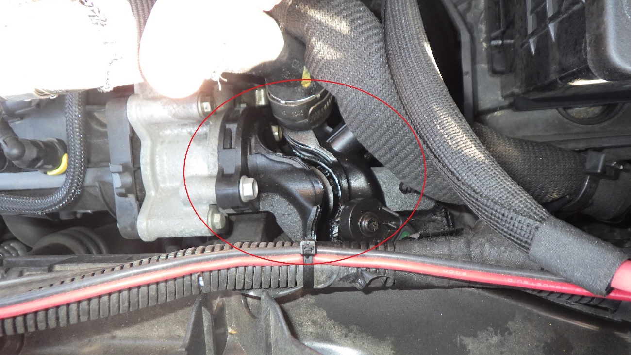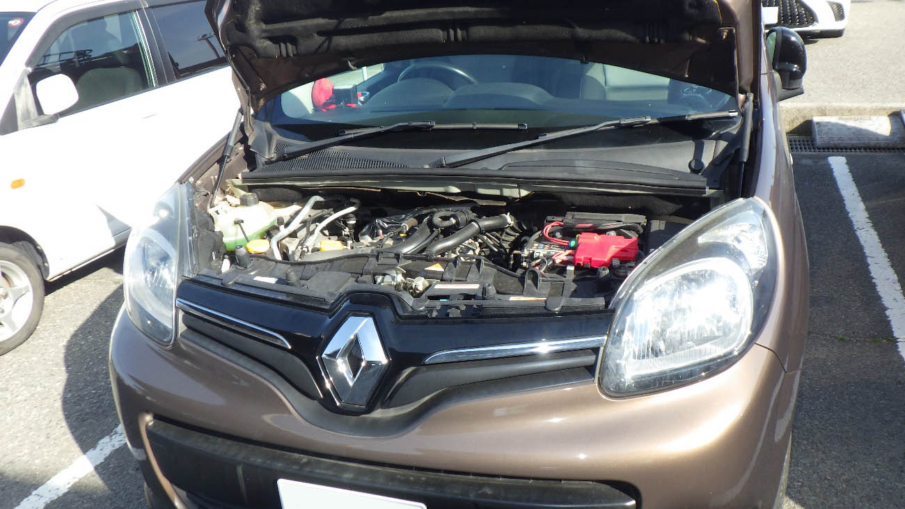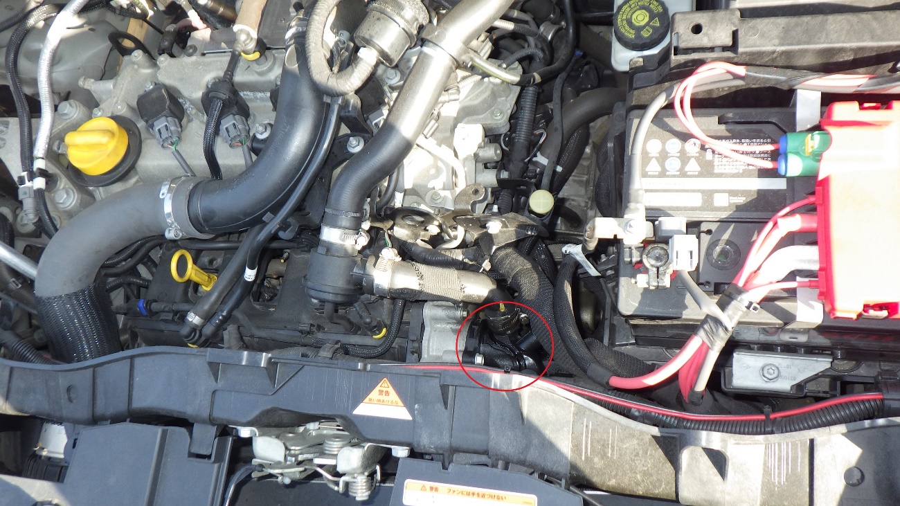 エンジンルームを開けて点検した結果、赤丸の部分の