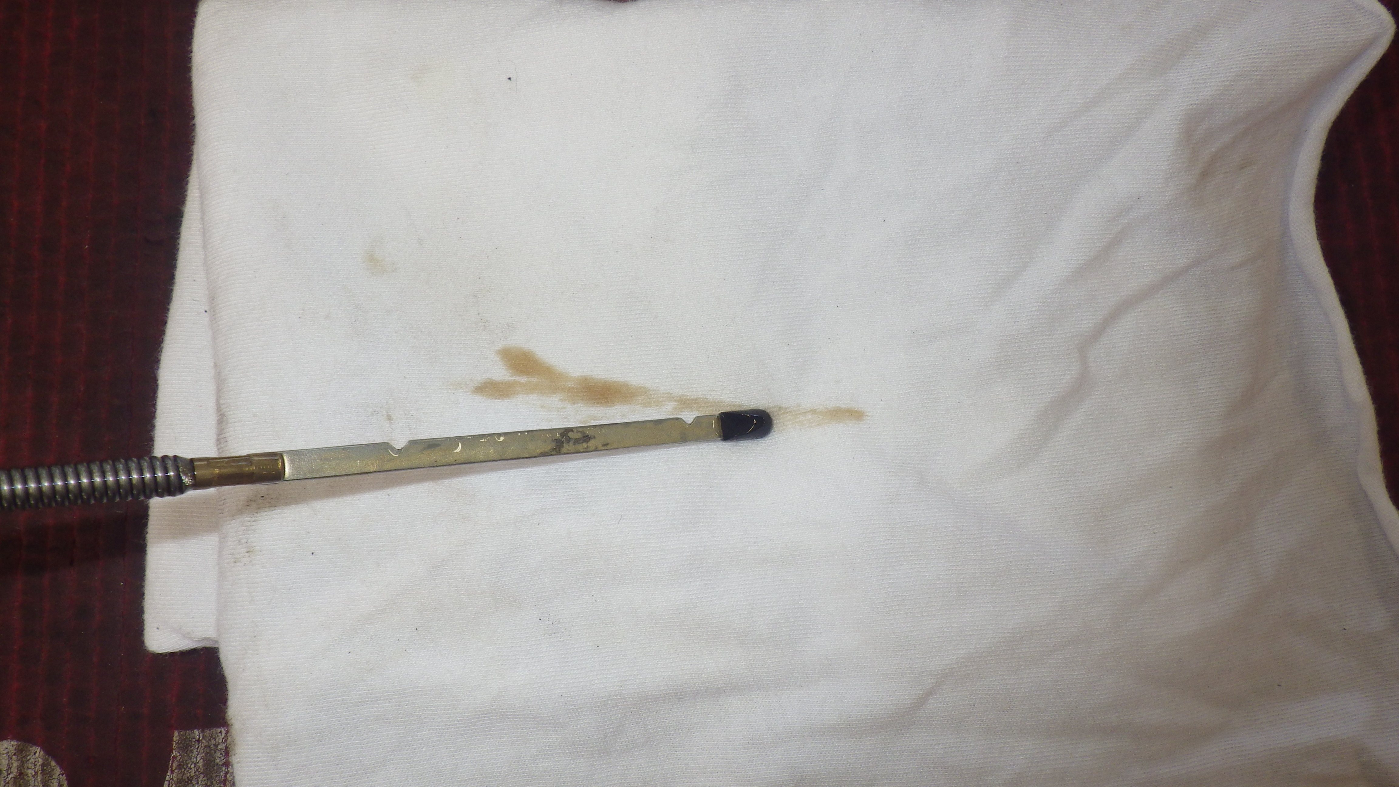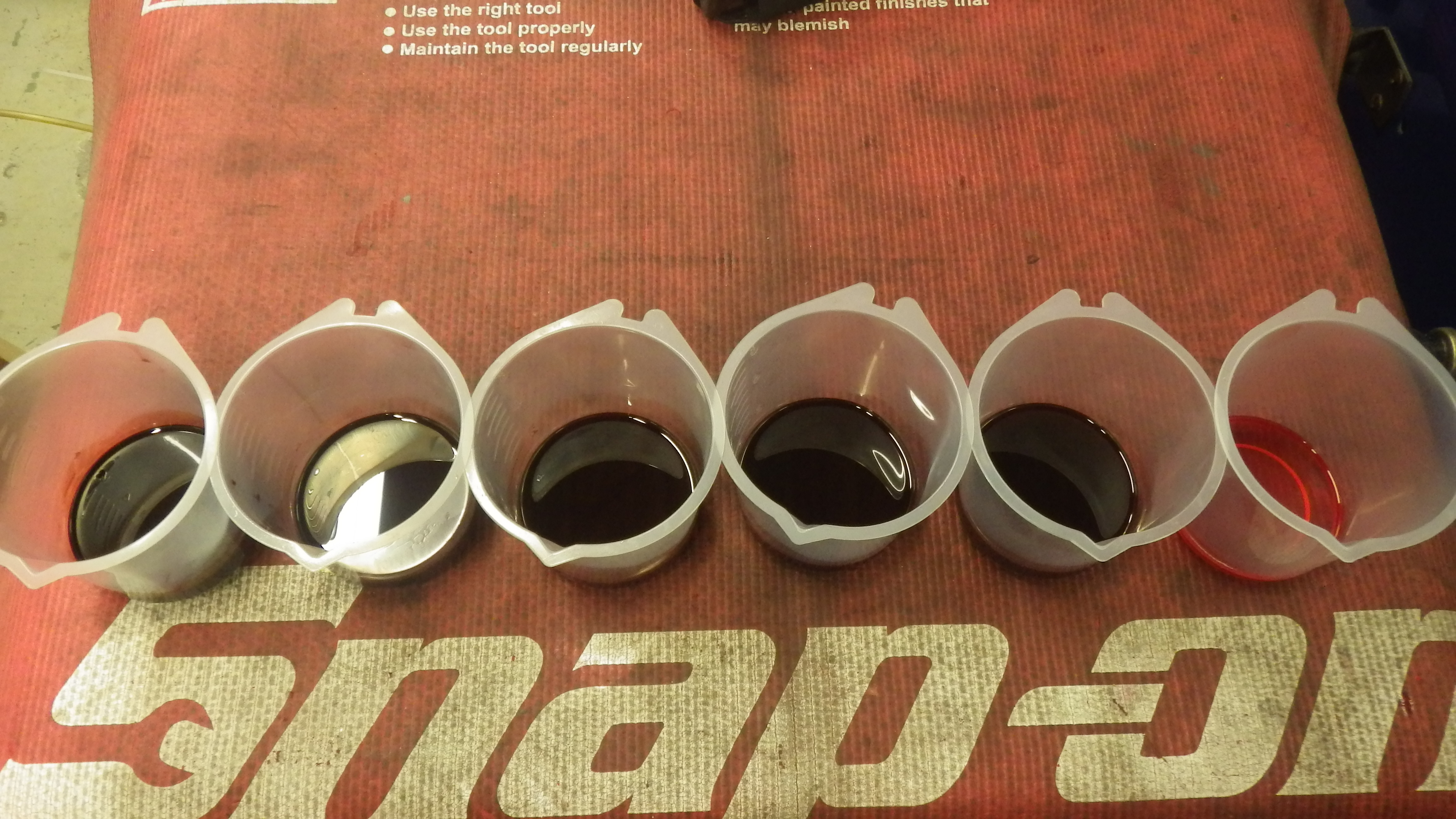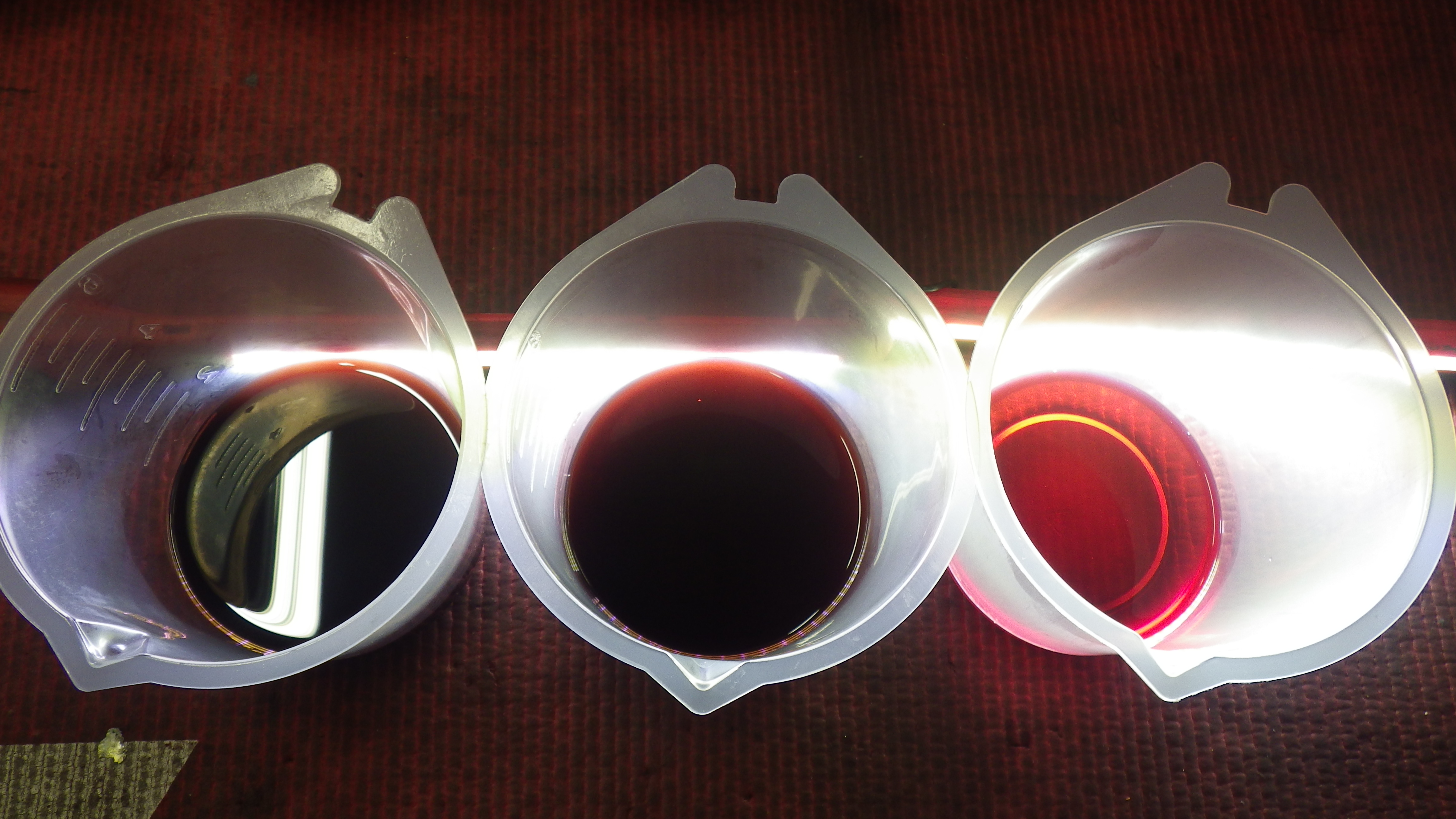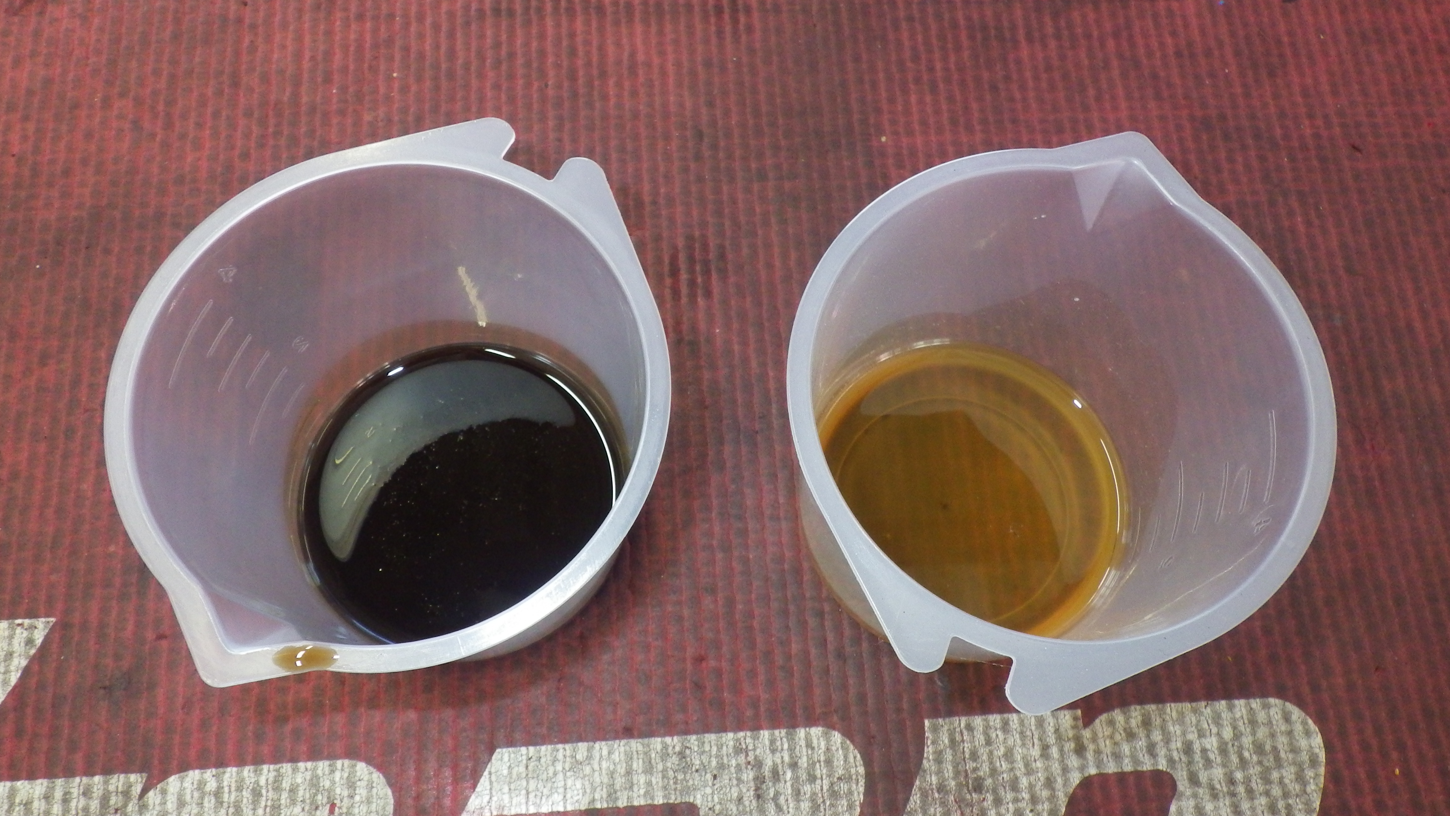 交換前、交換後のオイルです。交換後オイル量の点検も実施しています。