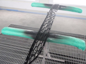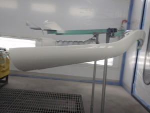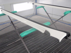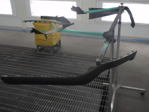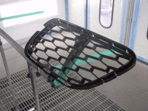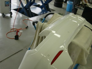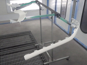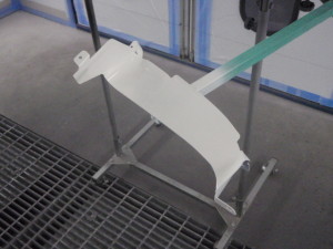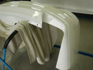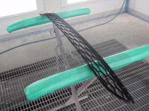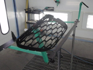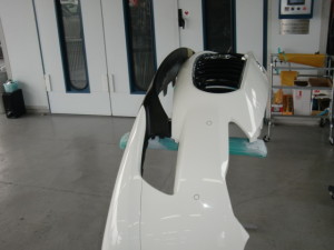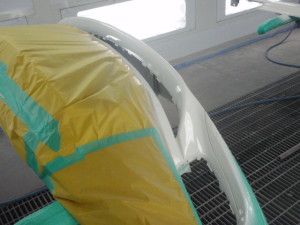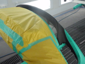 ボディー色にペイントする部品も同様に足付け作業を行った後、マスキング作業、シリコンオフで脱脂、エアブローして、塗装作業開始です。