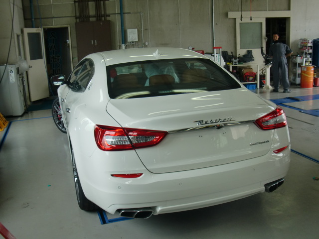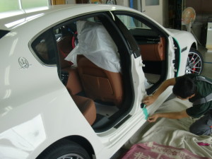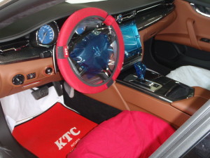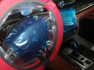 入庫時確認作業の後室内のキズ汚れ防止の為に、シート・ハンドルカバー、保護テープの貼り付け作業を行いました。