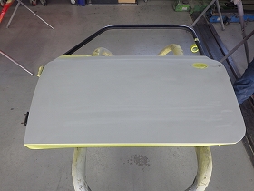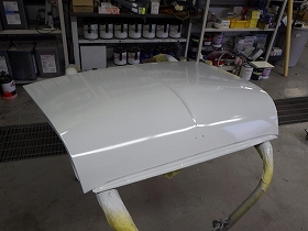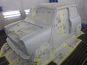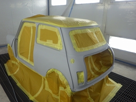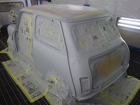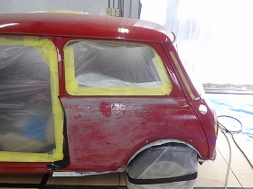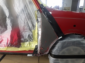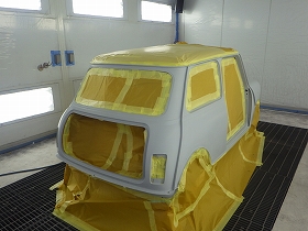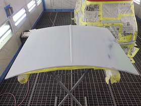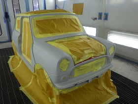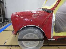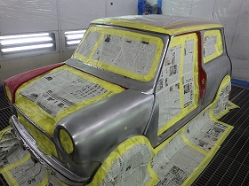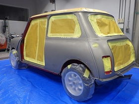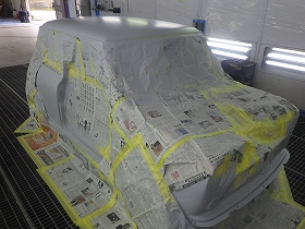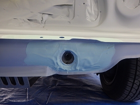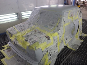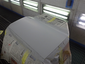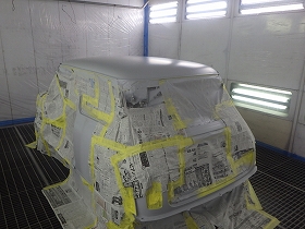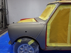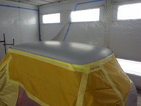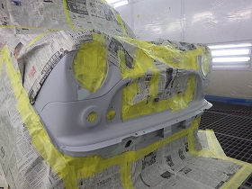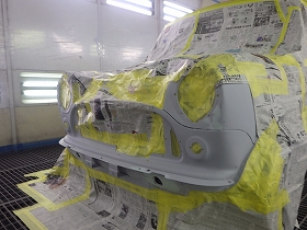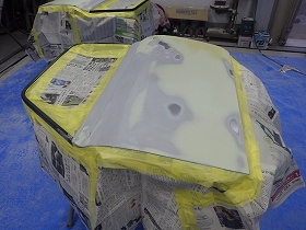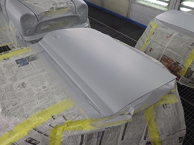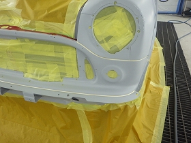 パテ修正作業の後、塗装準備(足付け、マスキング、脱脂、エアブロー)を行い、サフェーサーの塗布作業を行いました。