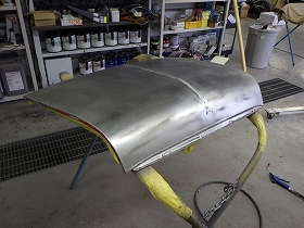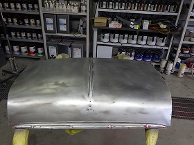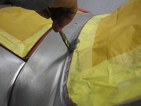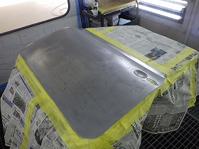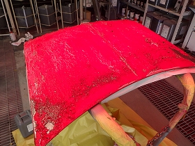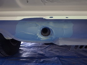剥離作業の後、塗装準備(足付け、マスキング、脱脂、エアブロー)を行い、密着性向上の為ウォッシュプライマー、サフェーサーの順に塗布作業を行いました。