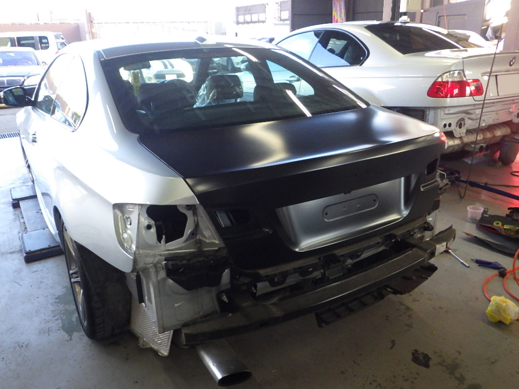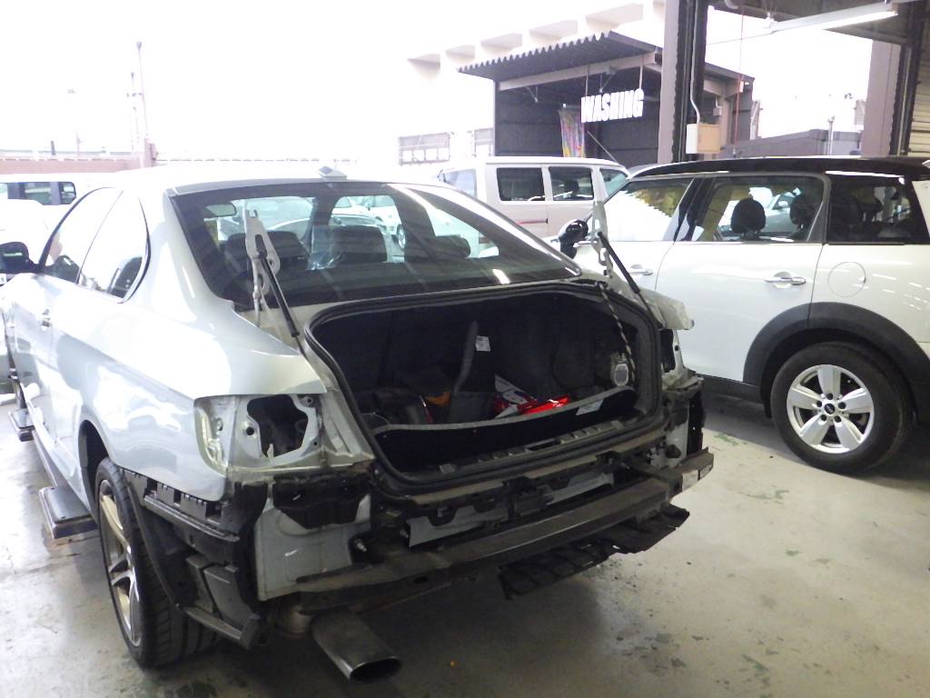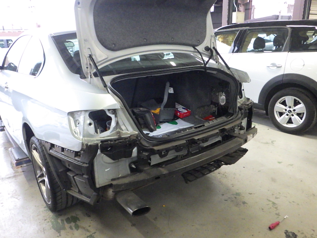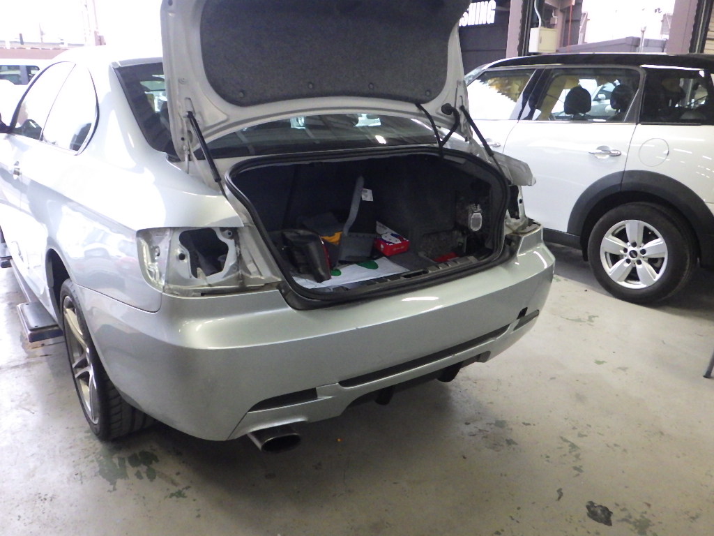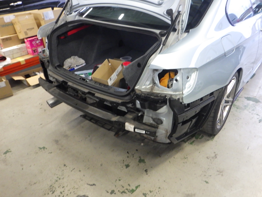 リヤバンパー、トランク交換の為、分解作業を行いました。