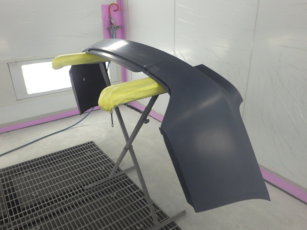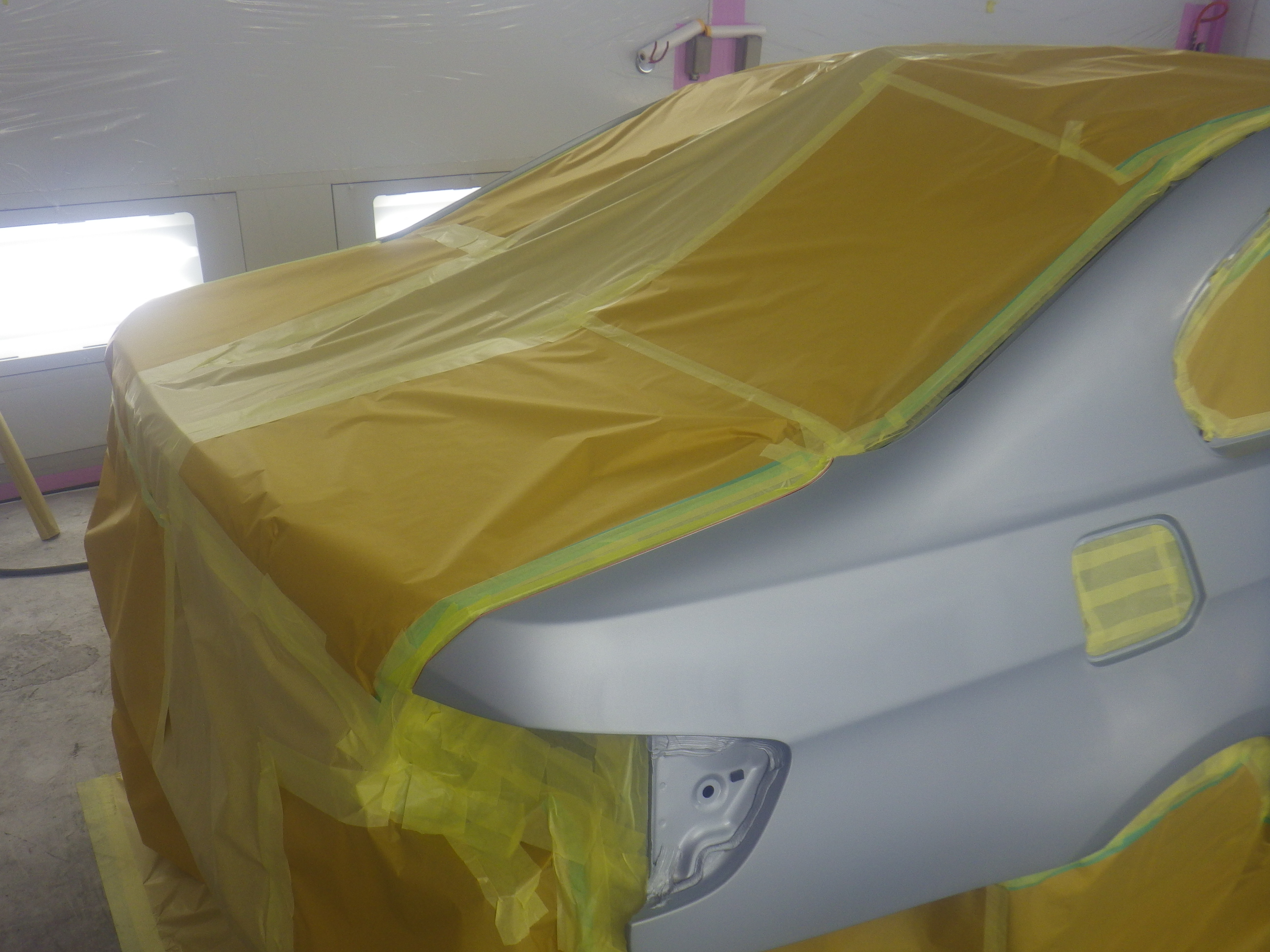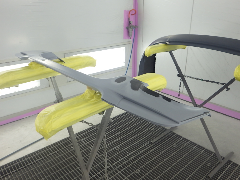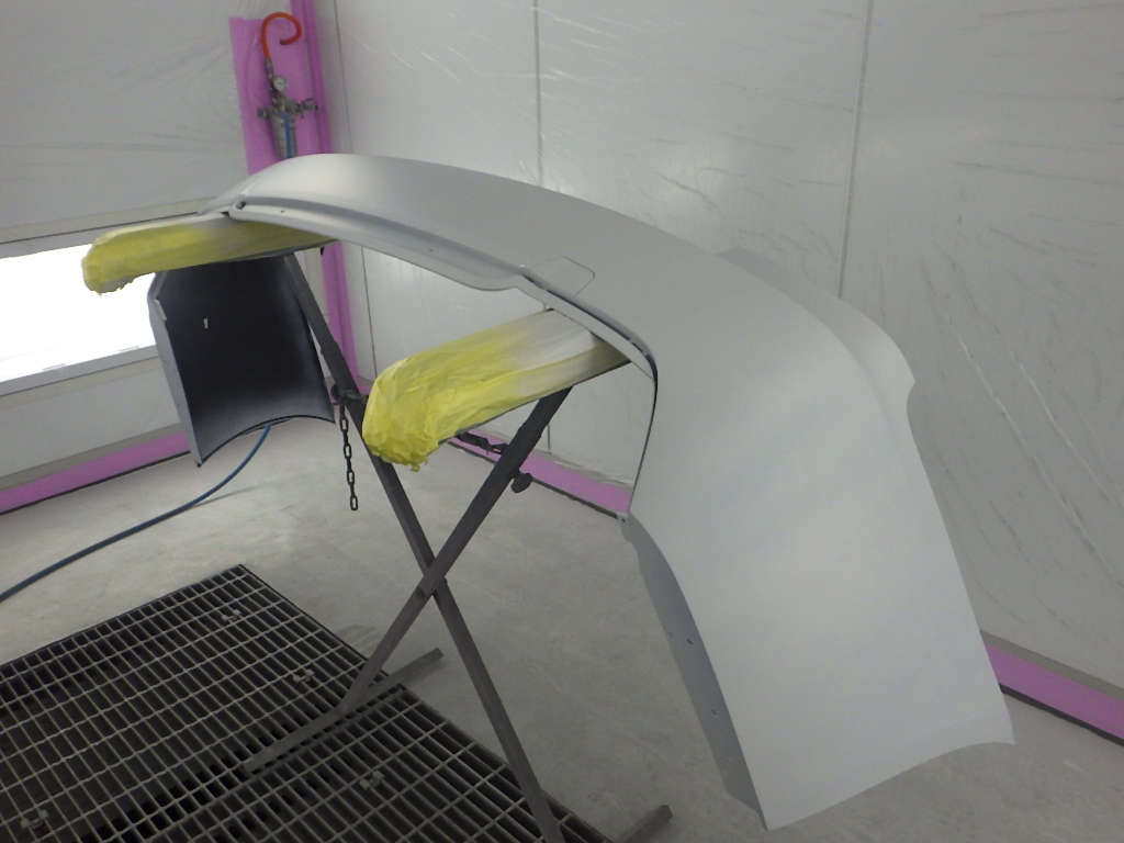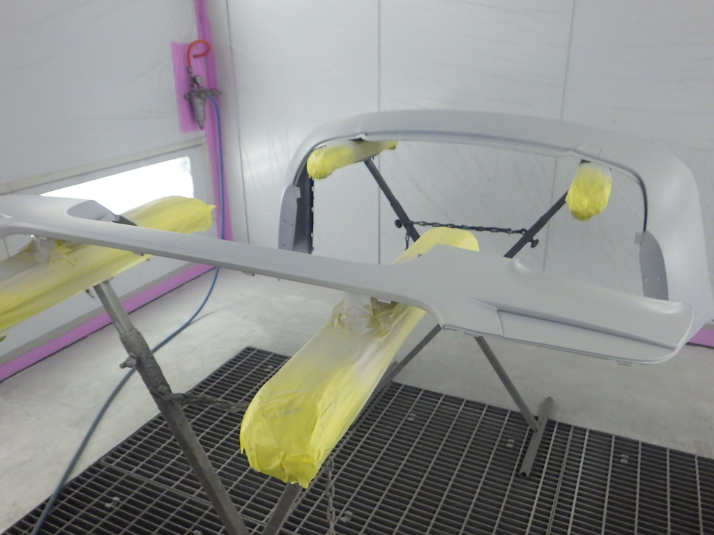 仮合わせ作業の後、塗装準備(足付け、マスキング、脱脂、エアブロー)を行い、