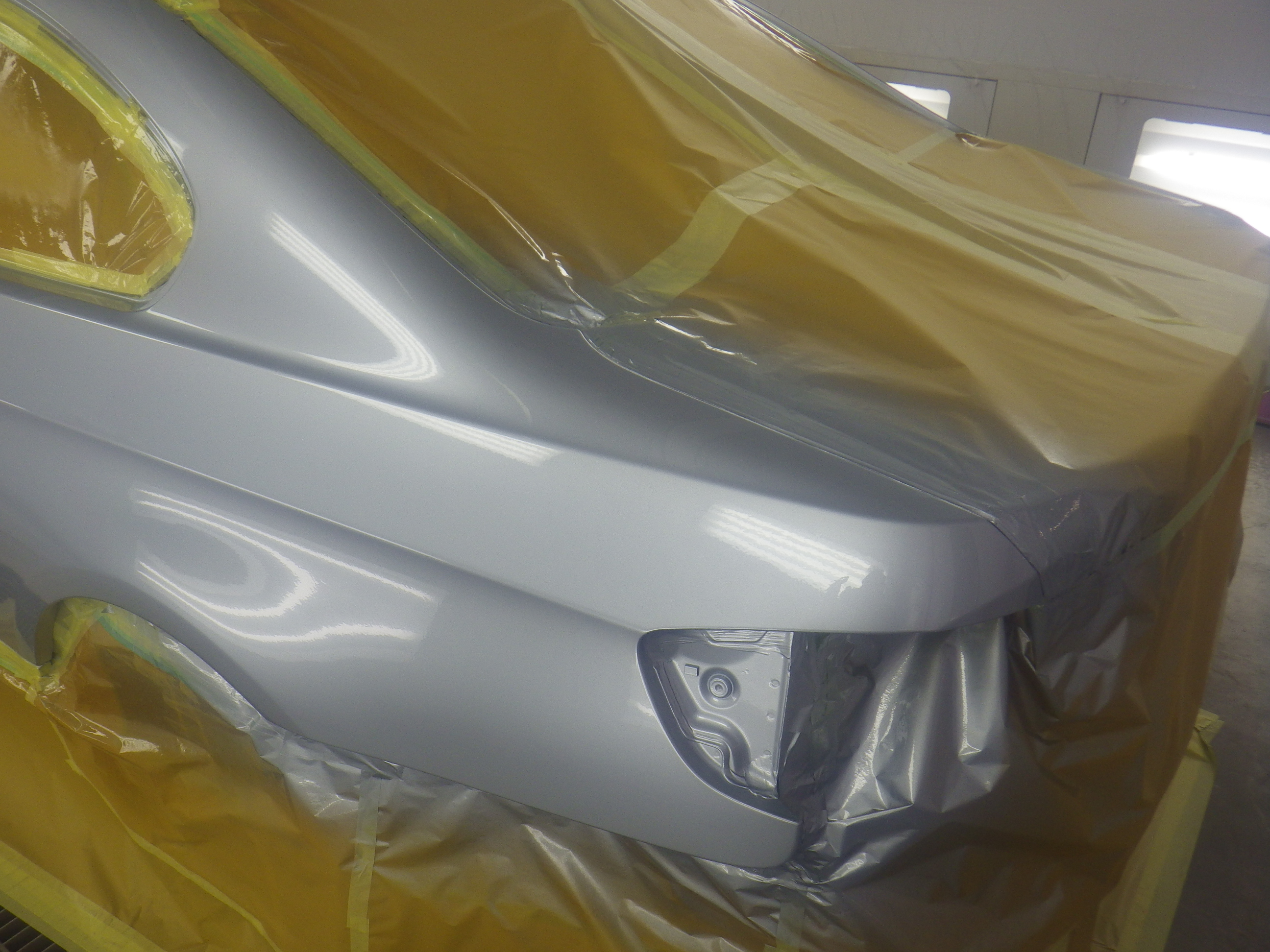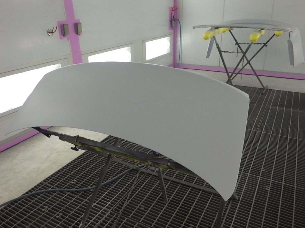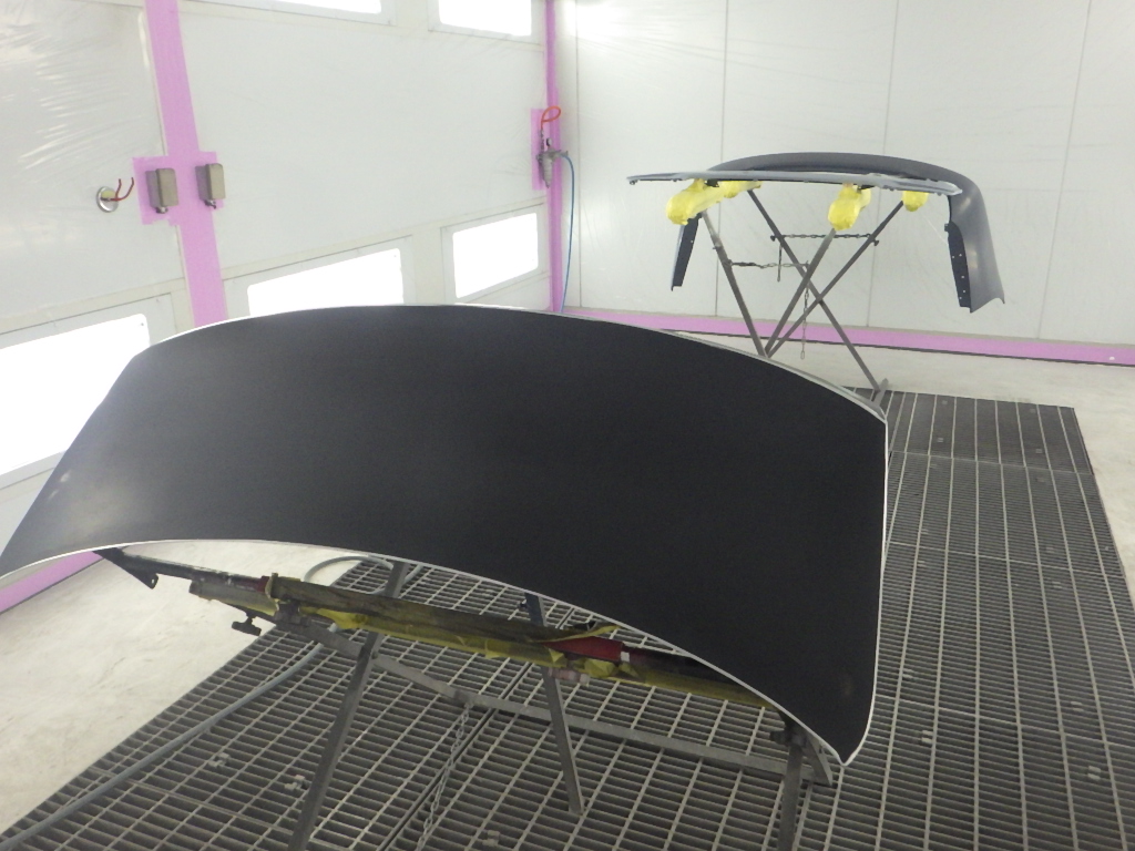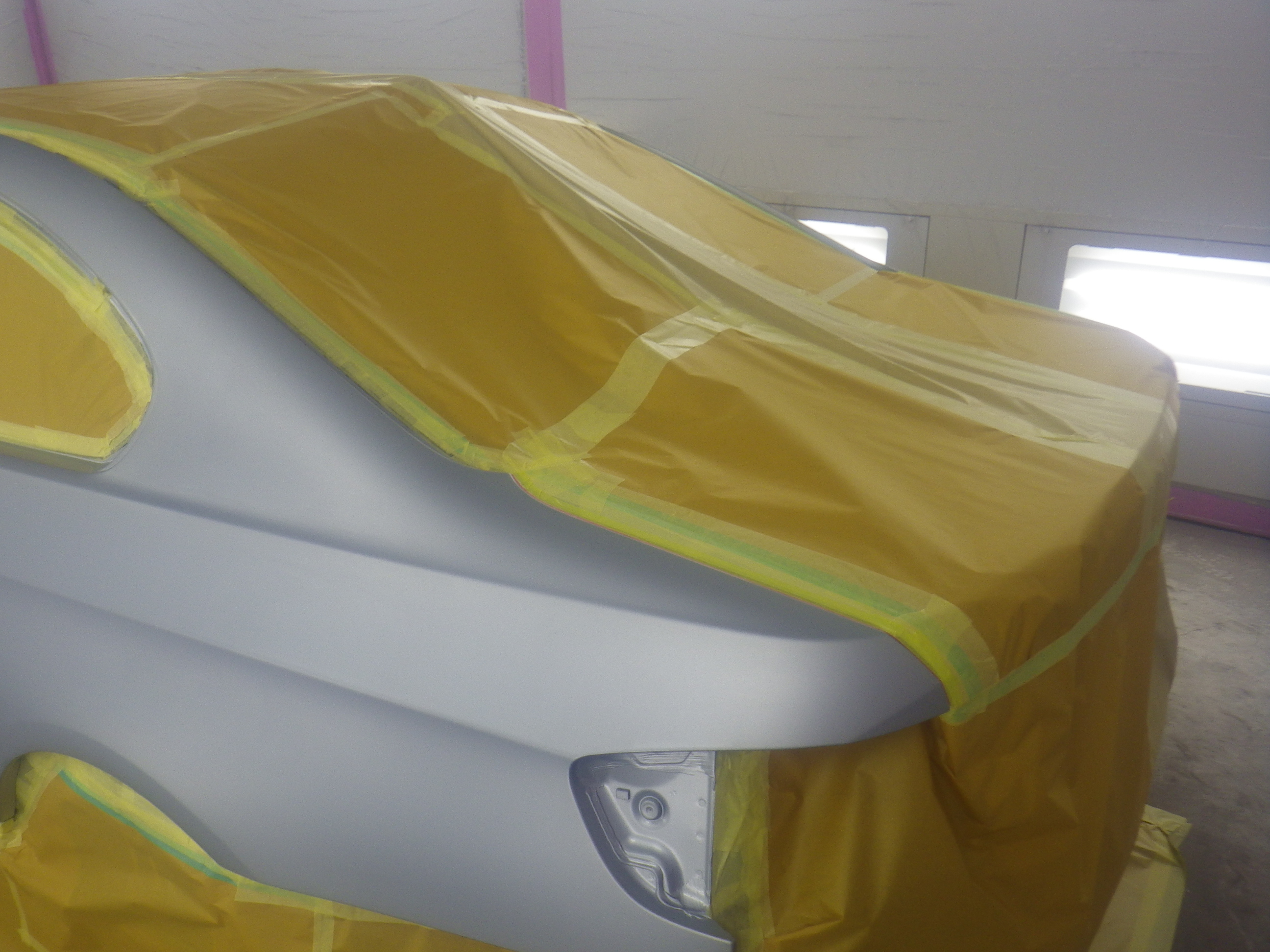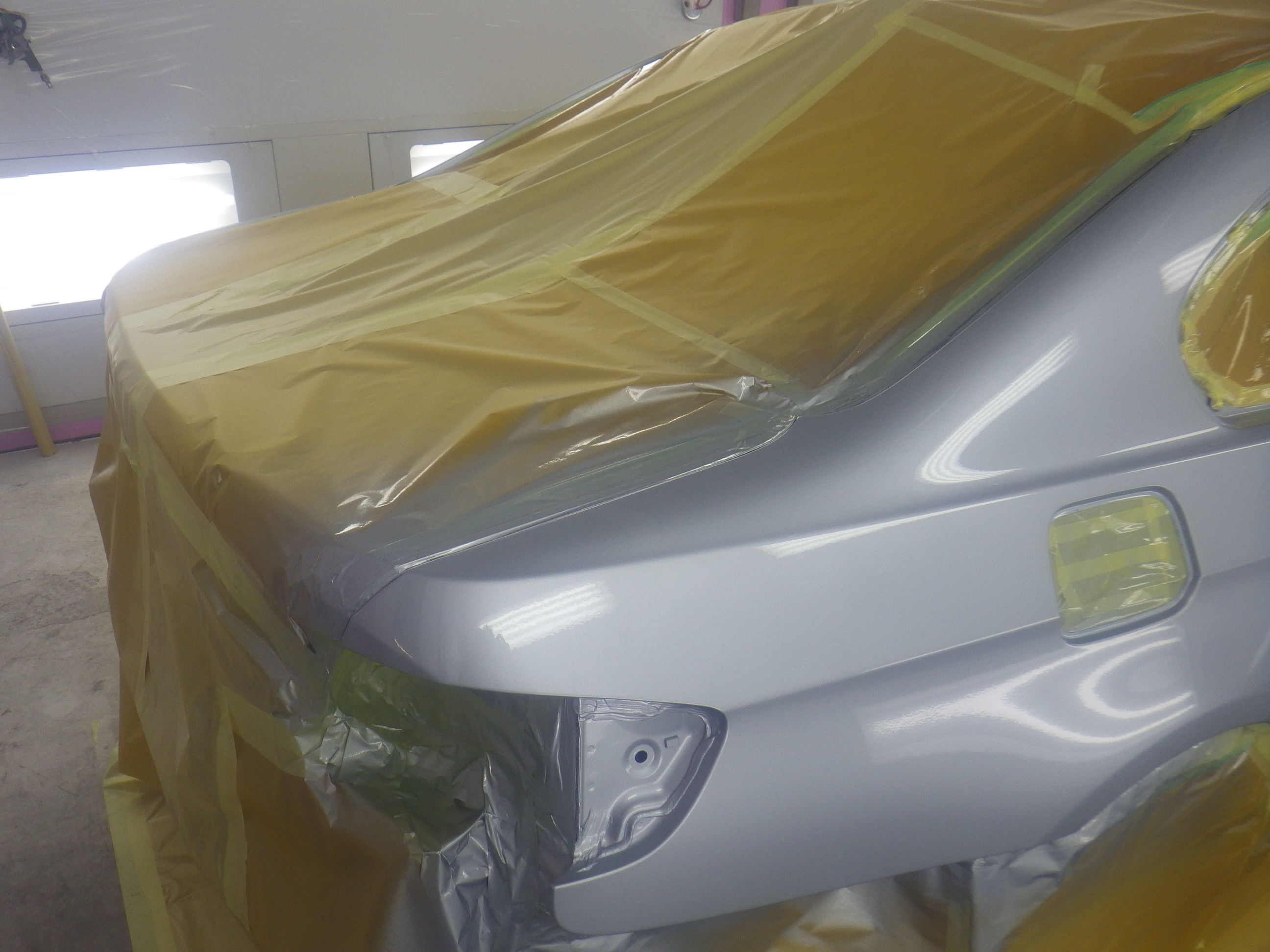 仮合わせ作業の後、塗装準備(足付け、マスキング、脱脂、エアブロー)を行い、