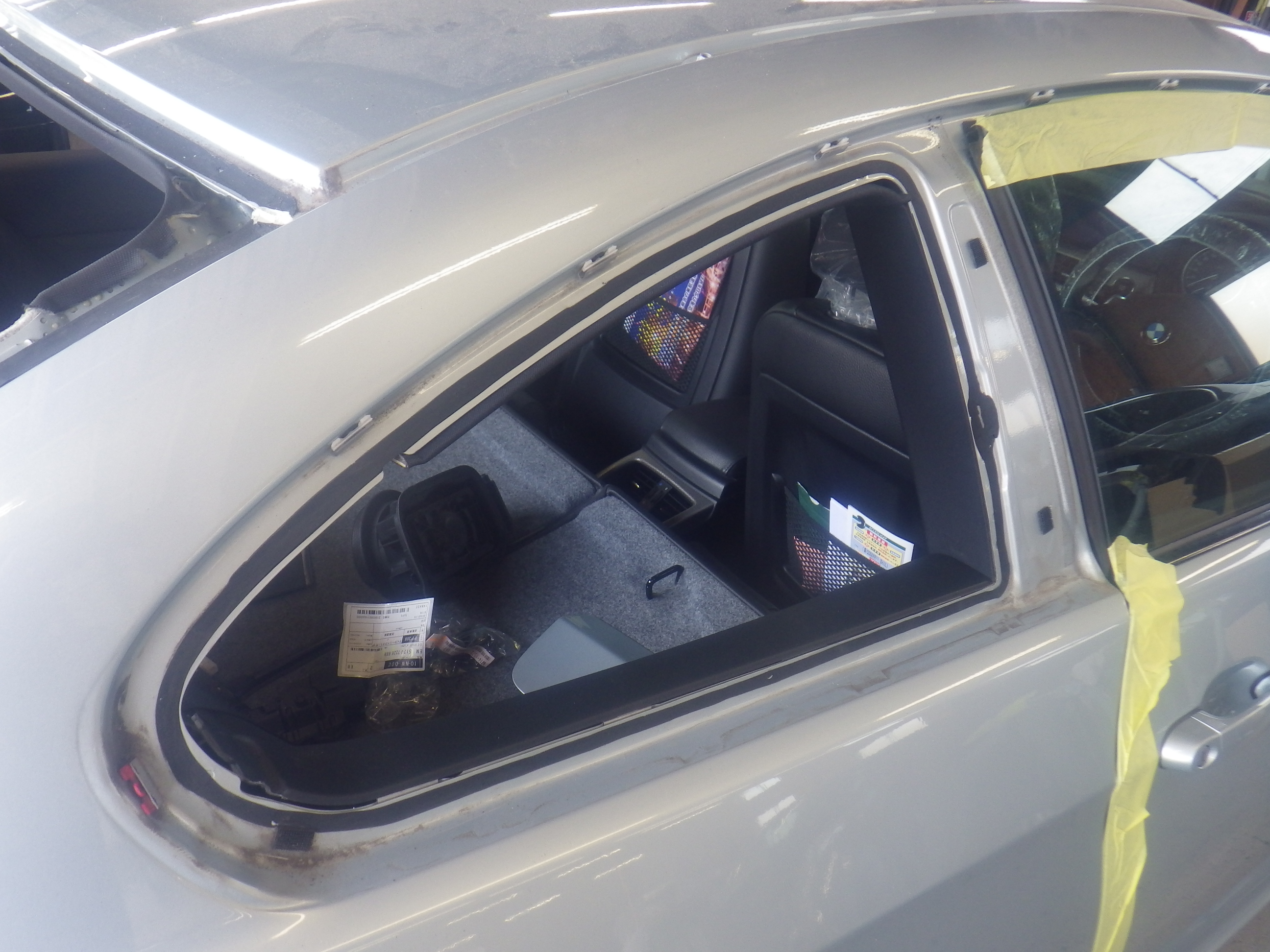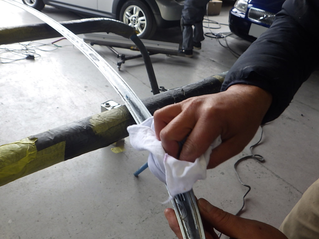ガラス外し作業の後、塗装準備(足付け、マスキング、脱脂、エアブロー)を行い、