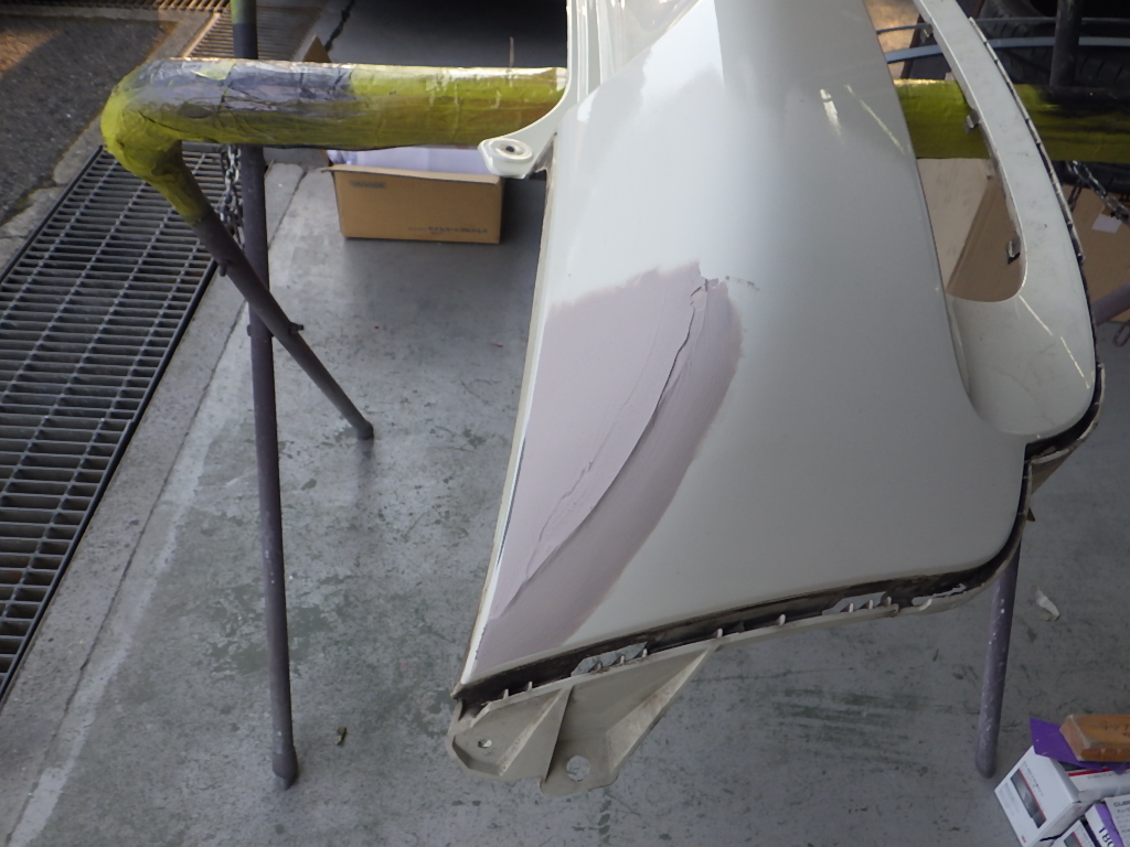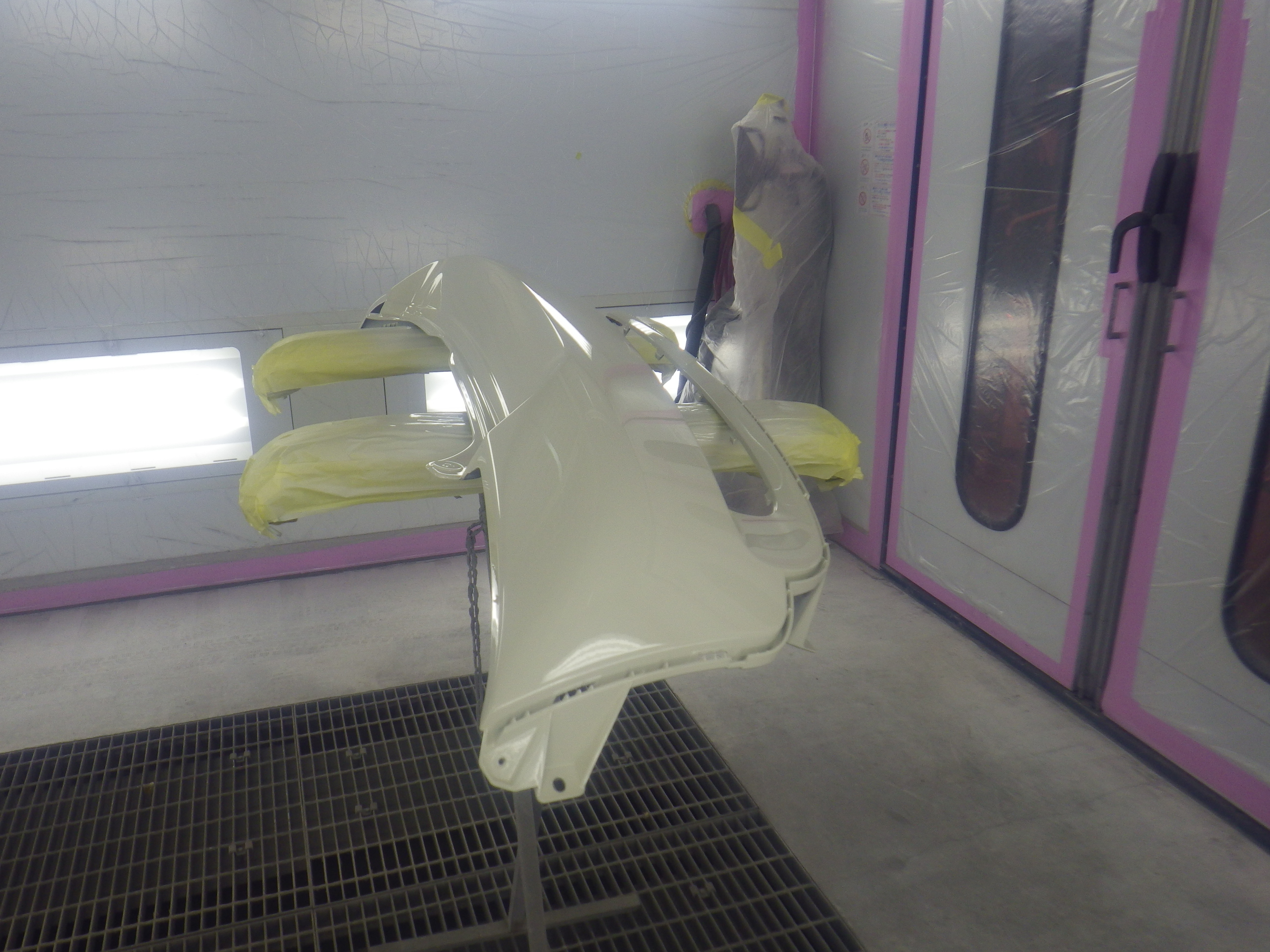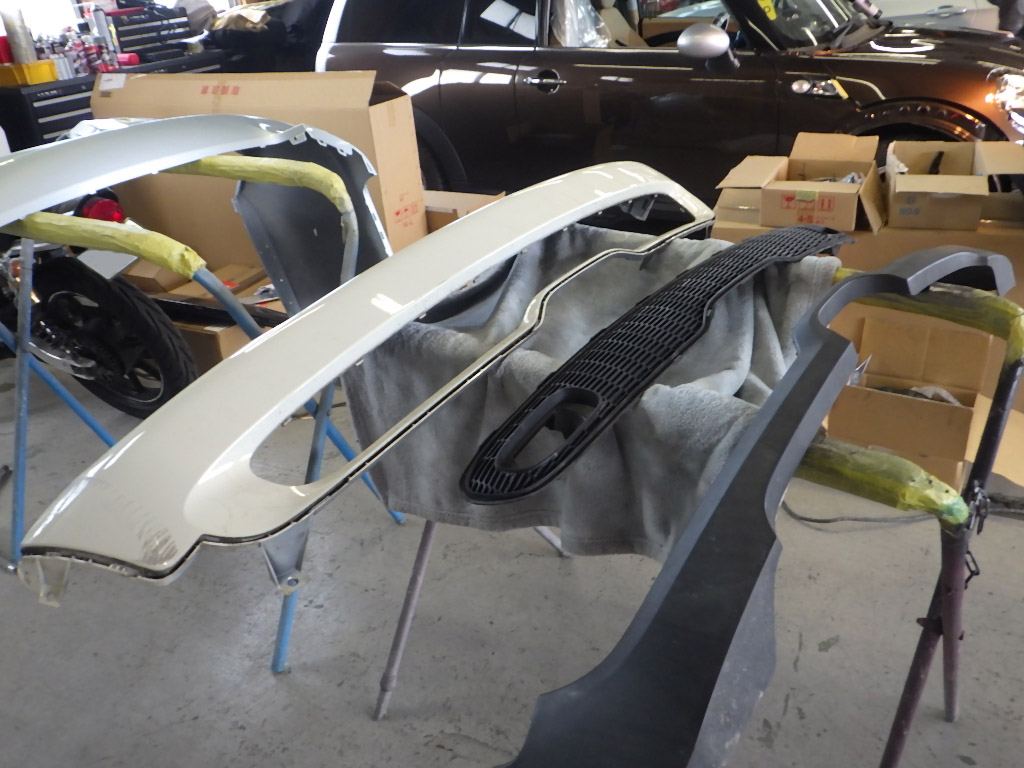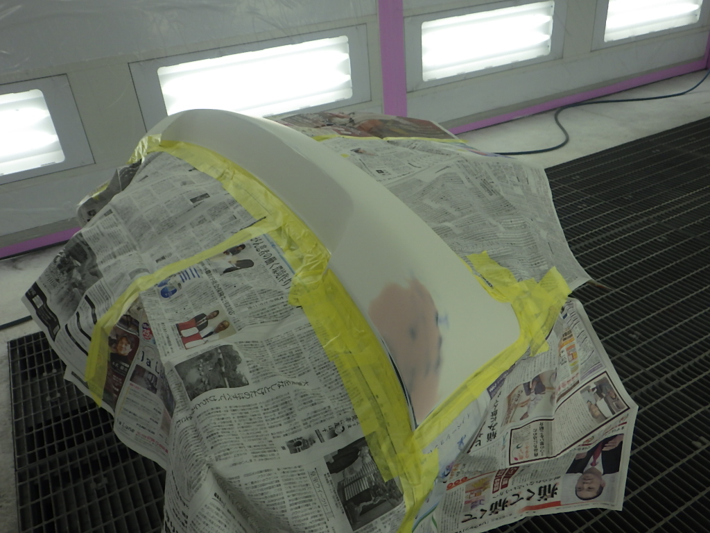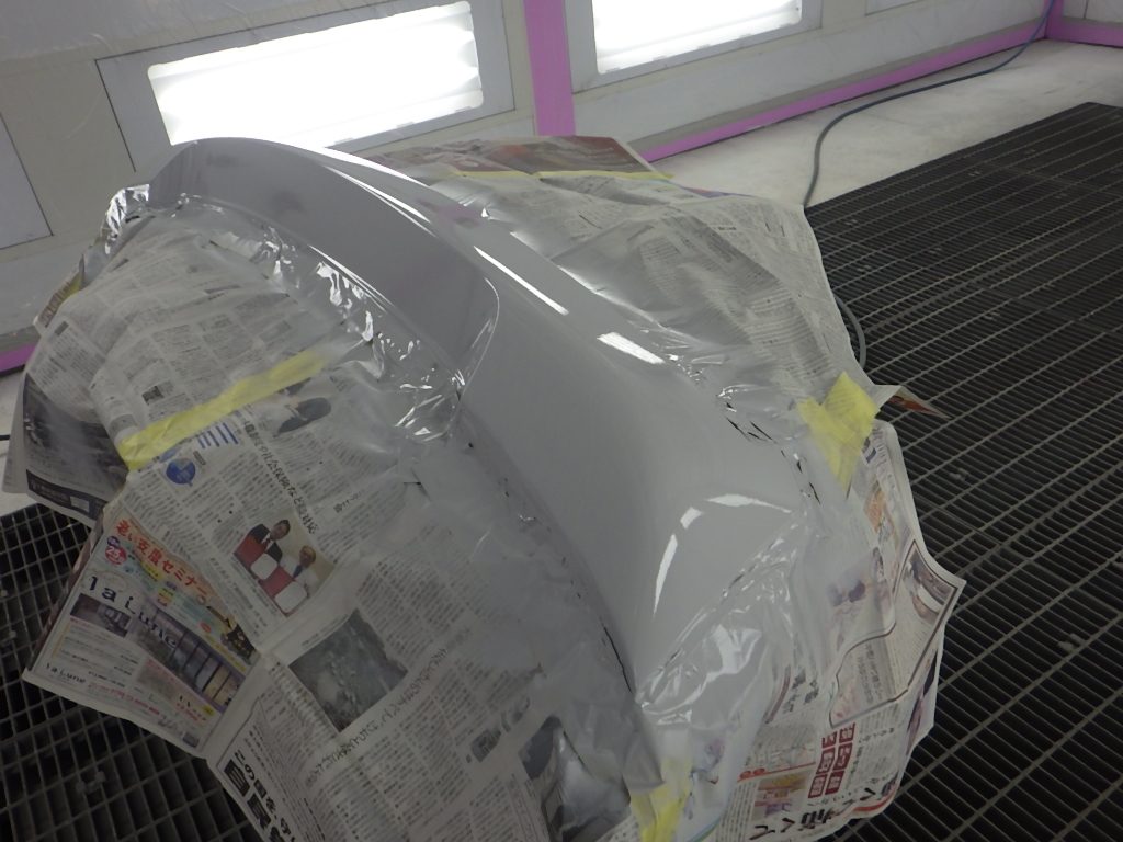仮合わせ作業の後、パテ修正作業を行い、塗装準備(足付け、マスキング、脱脂、エアブロー)を行いました。