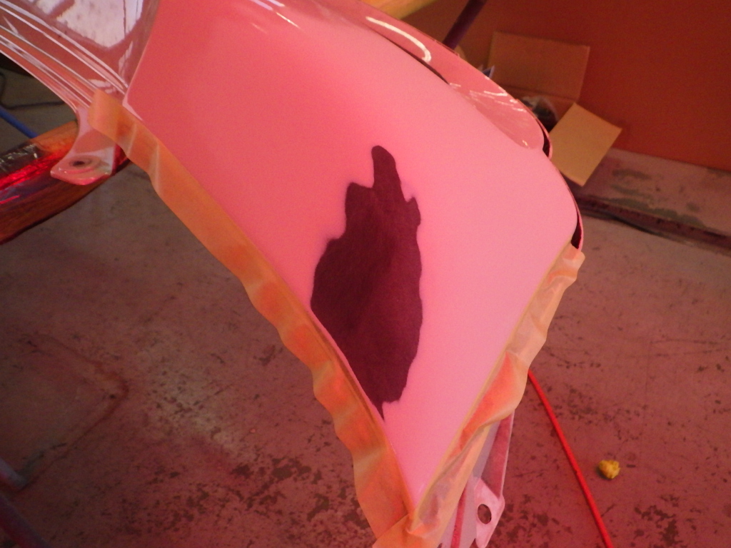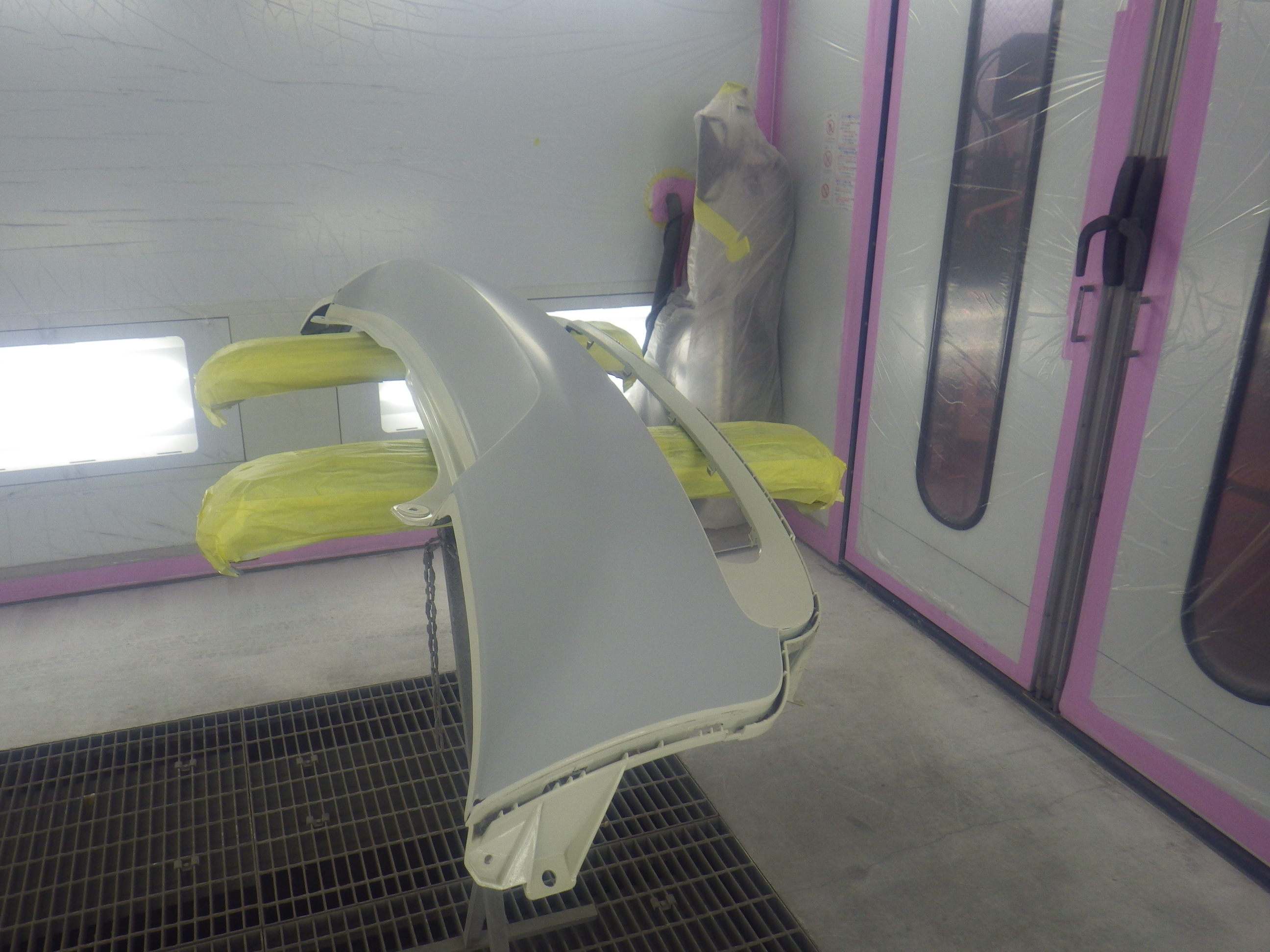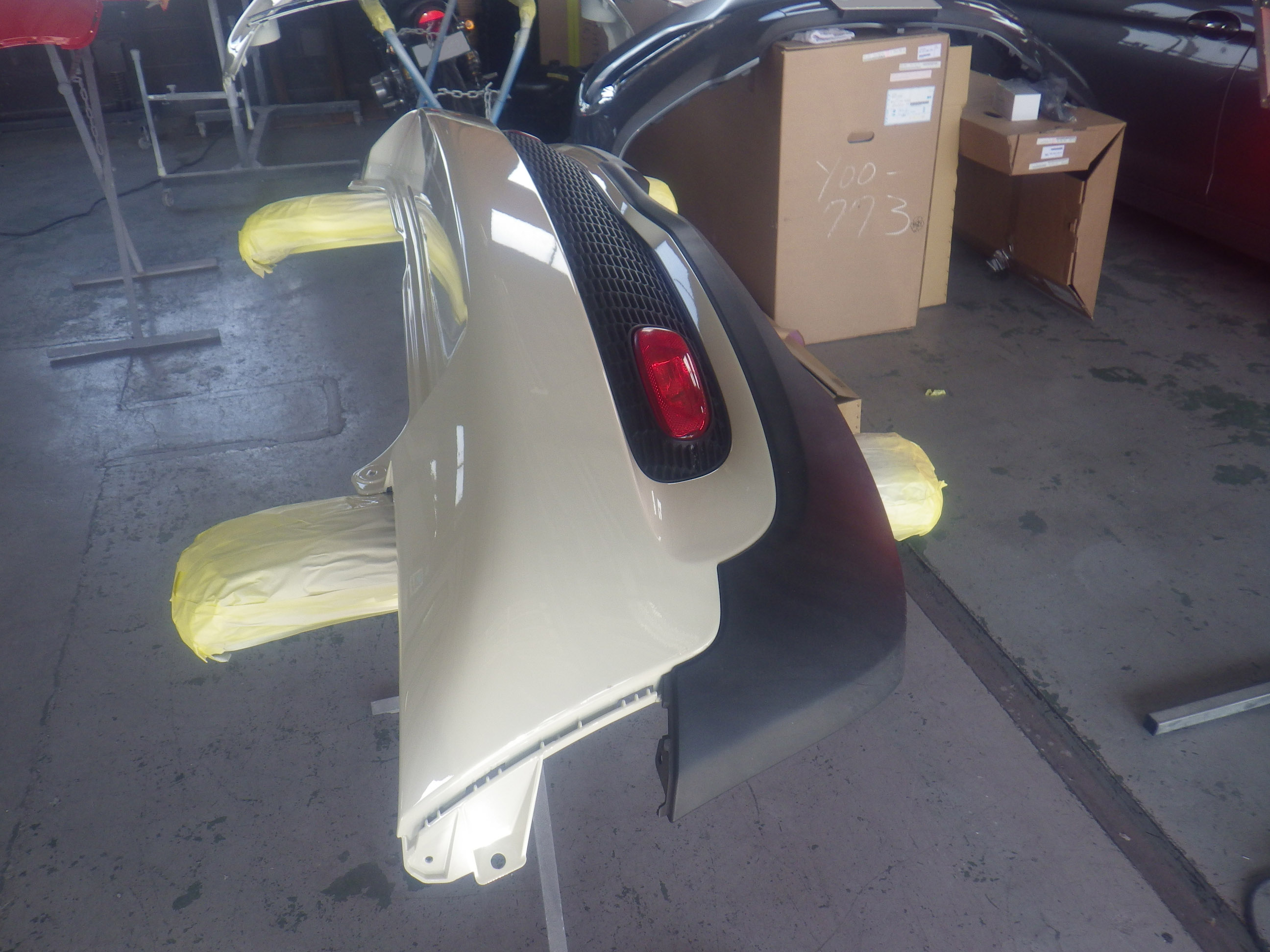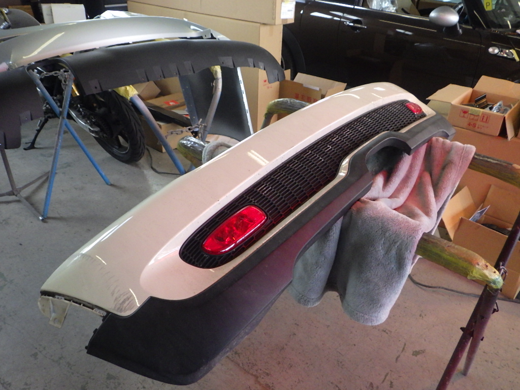 仮合わせ作業の後、パテ修正作業を行い、塗装準備(足付け、マスキング、脱脂、エアブロー)を行いました。