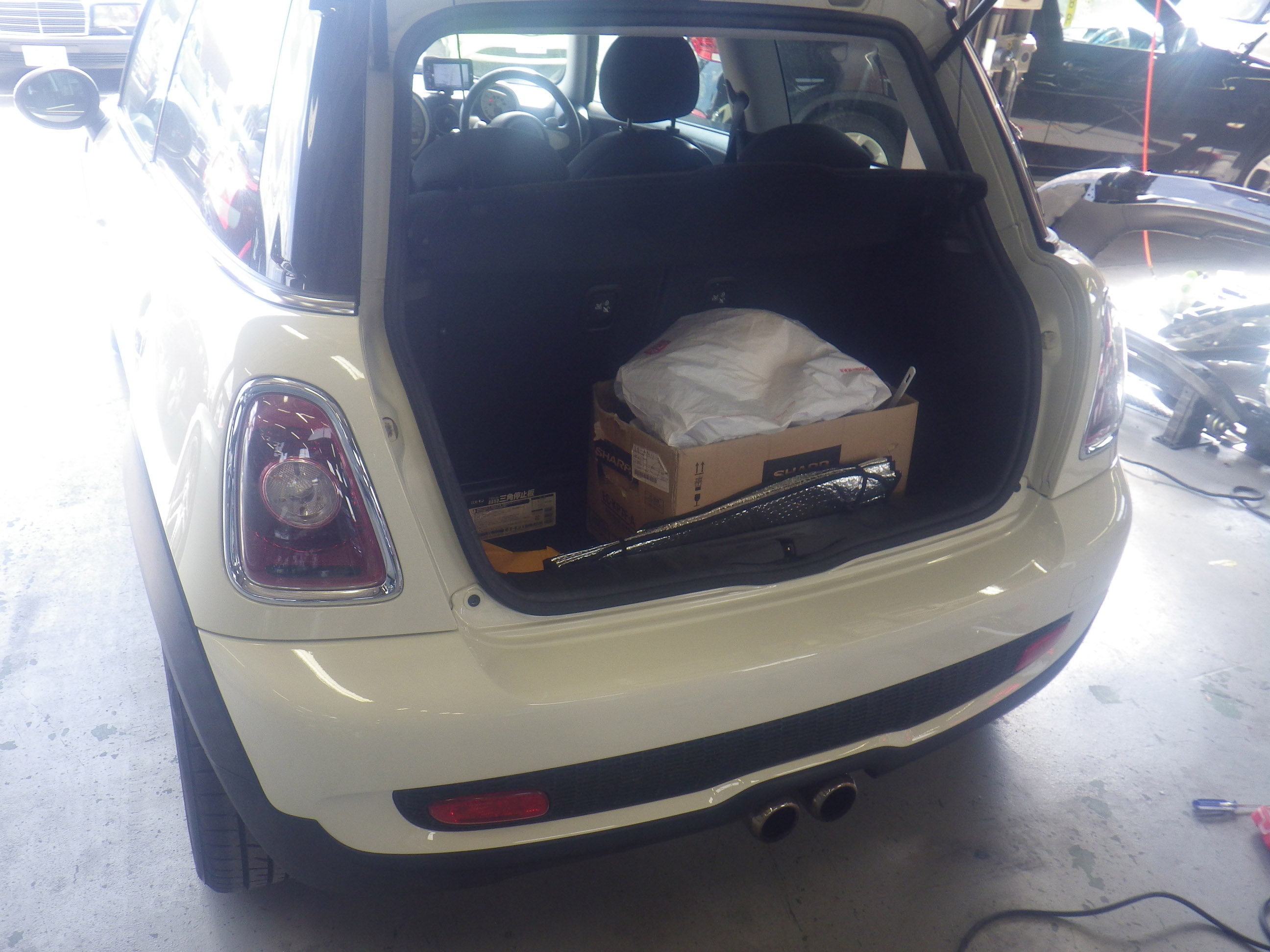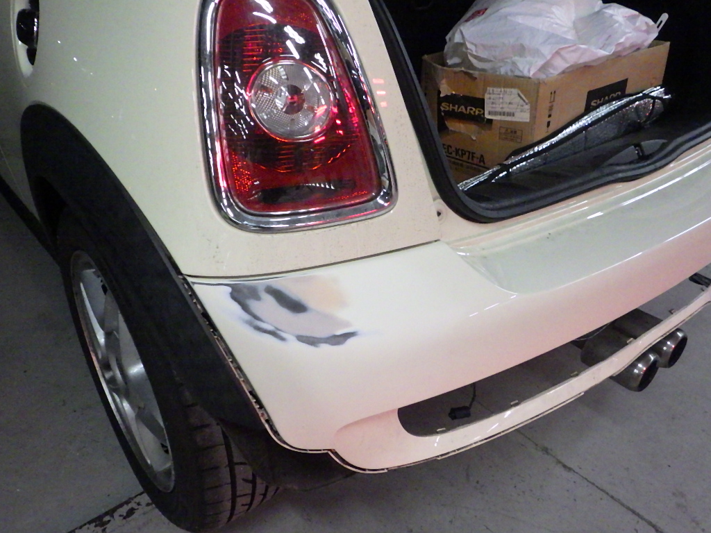 Home » 未分類 » 【鈑金塗装】【事故】兵庫県、神戸市、T様、2009y、MINI、R56、リアバンパー損傷へこみ修理レポートです!ありがとうございました。