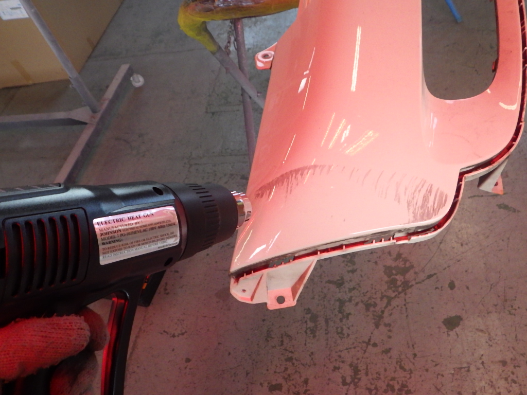 分解作業の後、ヒートガンを使用してへこみ修正を行いました。
