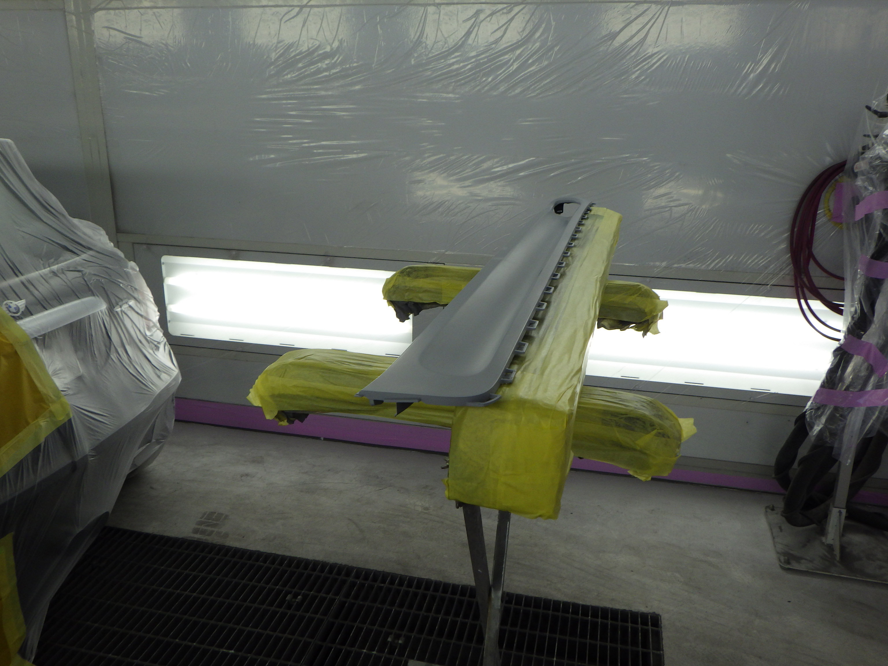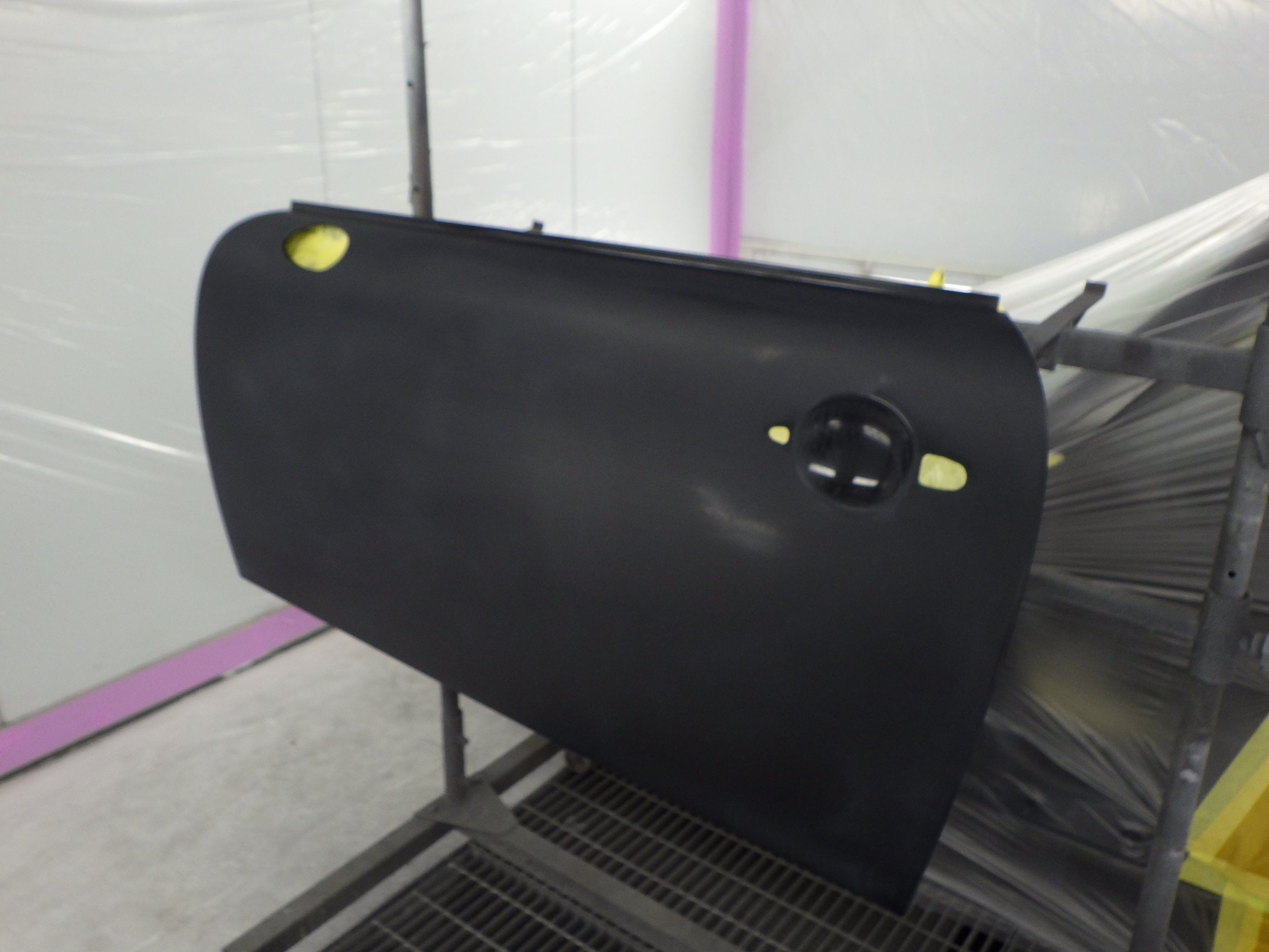 板金作業の後、マスキング作業、脱脂作業、エアブローを行い、