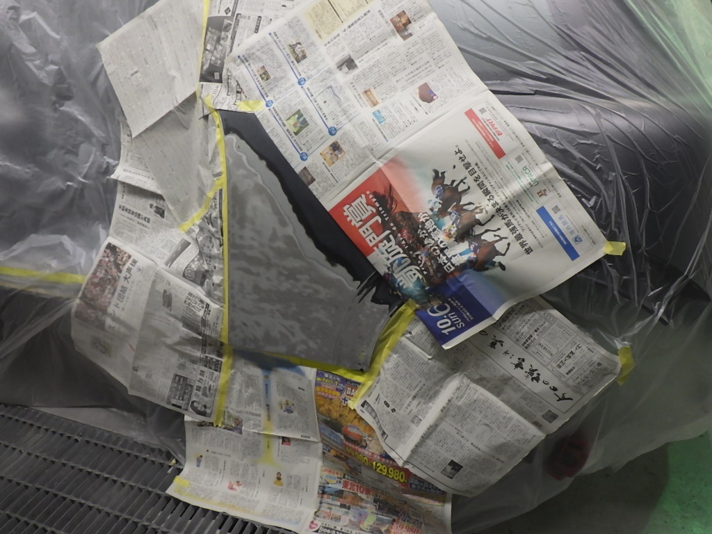 パテ乾燥の後、サンディング作業、マスキング作業、脱脂作業エアブローを行い、