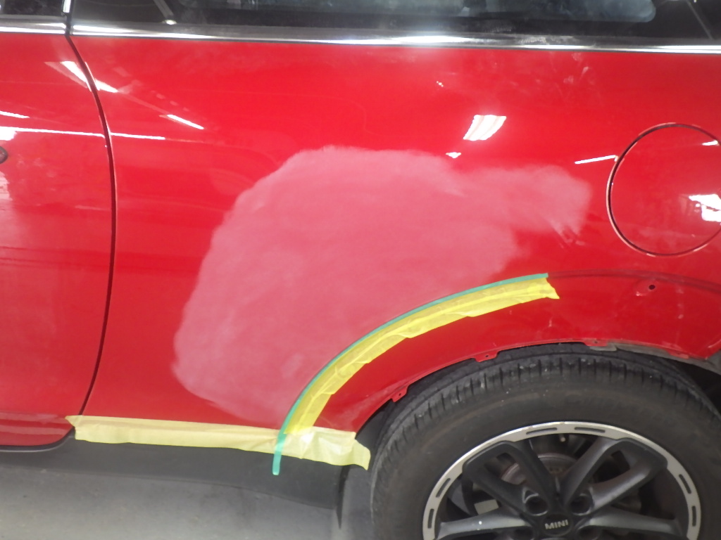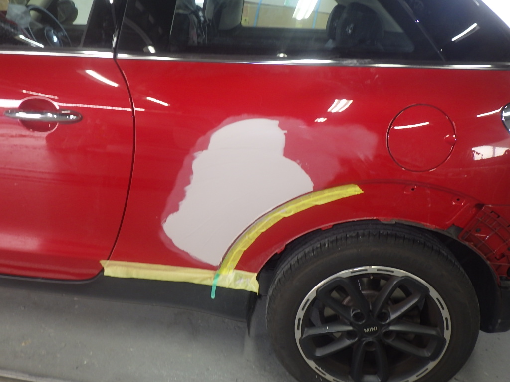 板金作業の後、パテ付け準備(足付け・マスキング・脱脂・エアブロー)を行い、