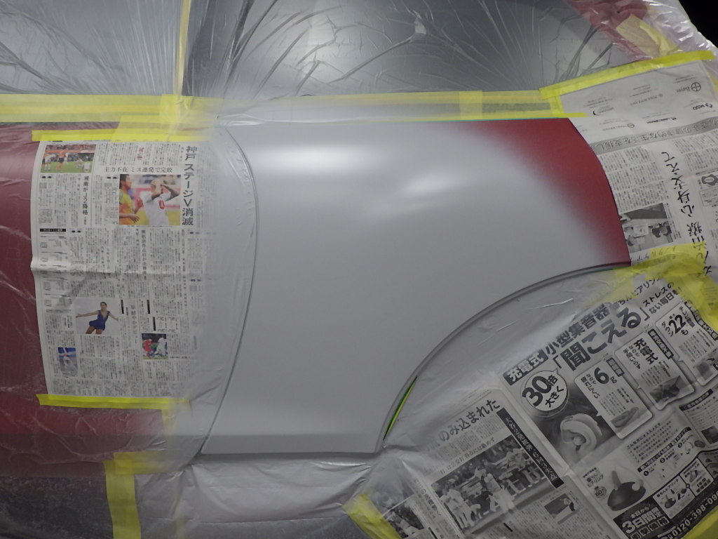 サフェーサー乾燥完了後、塗装準備(足付け、マスキング、脱脂、エアブロー)を行い、